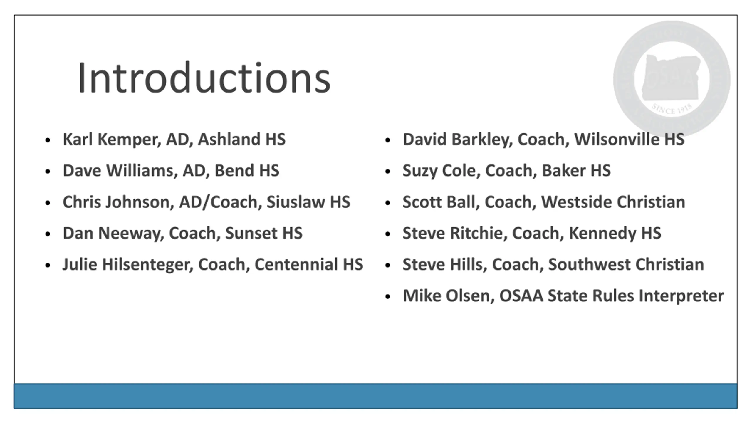 Introductions Karl Kemper, AD, Ashland HS David Barkley, Coach, Wilsonville HS Dave Williams, AD, Bend HS Suzy Cole, Coach, Baker HS Chris Johnson, AD/Coach, Siuslaw HS Scott Ball, Coach, Westside Christian Dan Neeway, Coach, Sunset HS Steve Ritchie, Coach, Kennedy HS Julie Hilsenteger, Coach, Centennial HS Steve Hills, Coach, Southwest Christian Mike Olsen, OSAA State Rules Interpreter