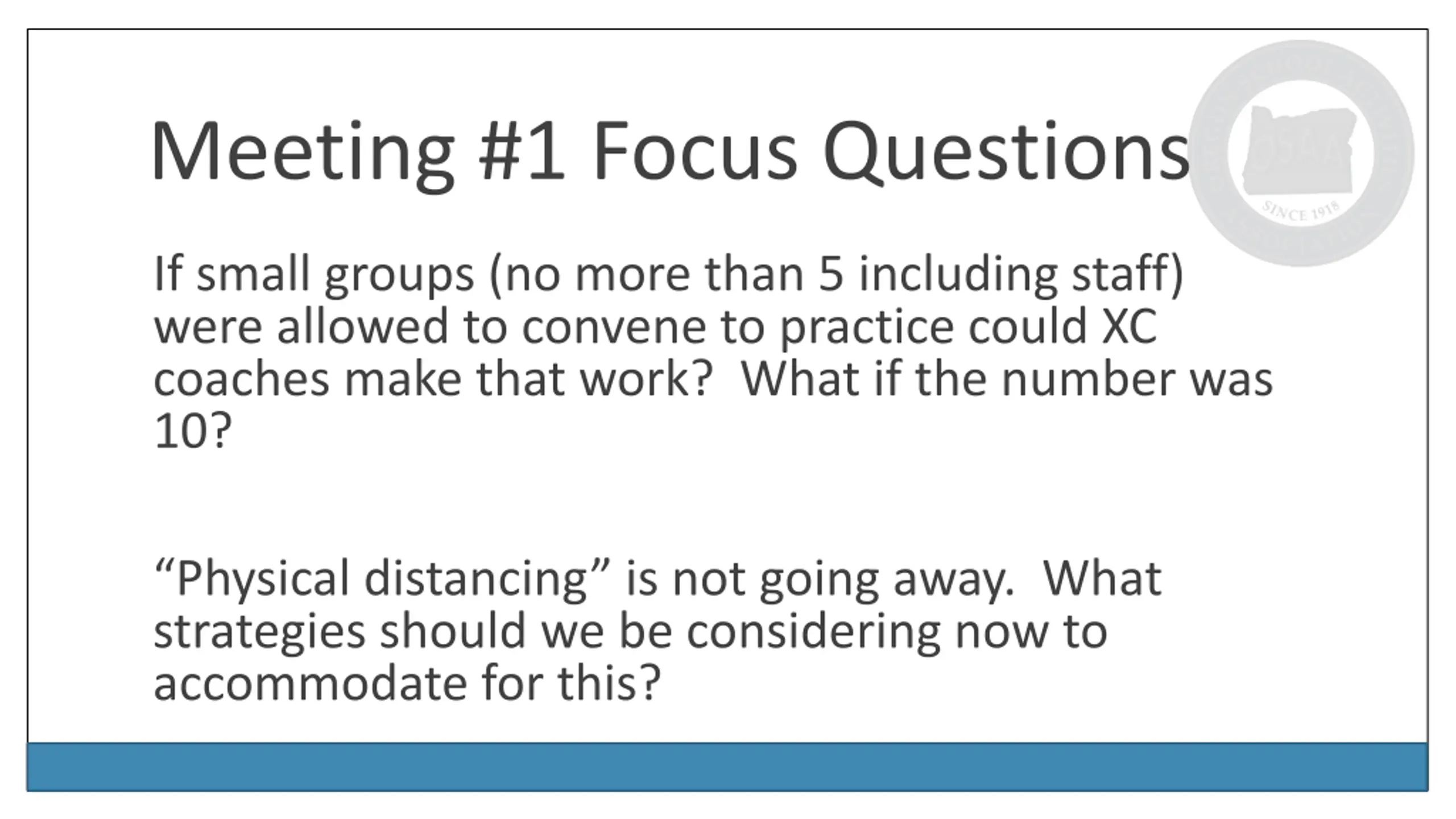 Meeting #1 Focus Questions If small groups (no more than 5 including staff) were allowed to convene to practice could XC coaches make that work? What if the number was 10? Physical distancing is not going away. What strategies should we be considering now to accommodate for this?