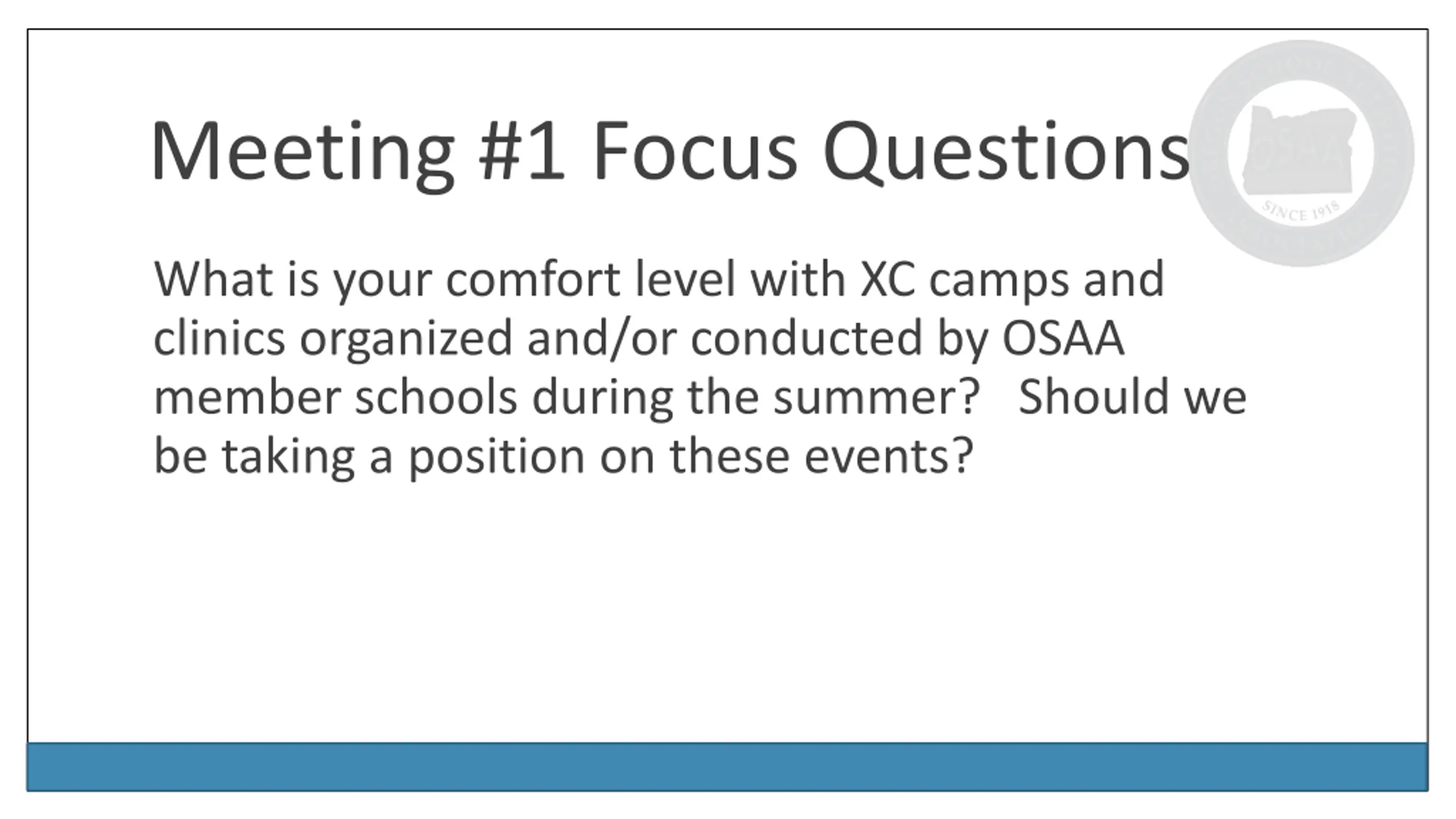 Meeting #1 Focus Questions What is your comfort level with XC camps and clinics organized and/or conducted by OSAA member schools during the summer? Should we be taking a position on these events?