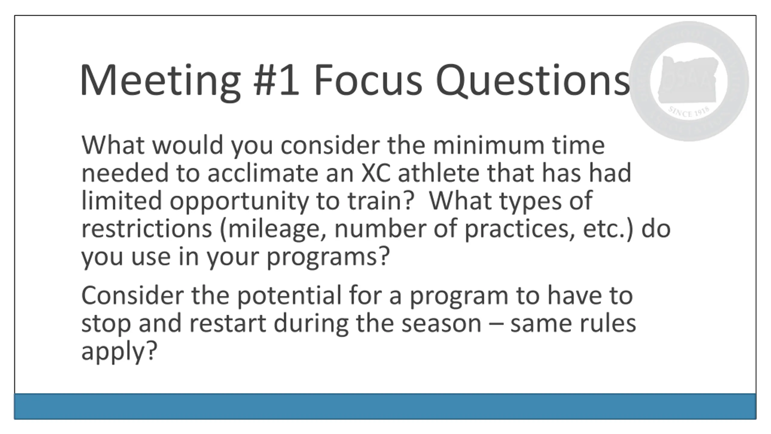 Meeting #1 Focus Questions What would you consider the minimum time needed to acclimate an XC athlete that has had limited opportunity to train? What types of restrictions (mileage, number of practices, etc.) do you use in your programs? Consider the potential for a program to have to stop and restart during the season same rules apply?