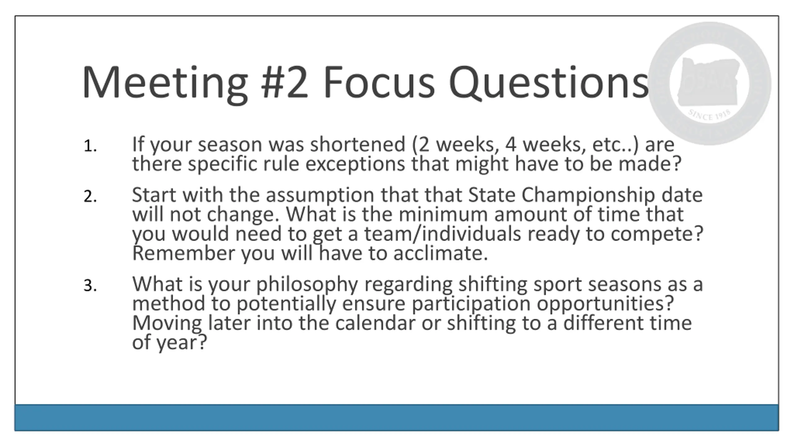 Meeting #2 Focus Questions If your season was shortened (2 weeks, 4 weeks, etc..) are there specific rule exceptions that might have to be made? Start with the assumption that that State Championship date will not change. What is the minimum amount of time that you would need to get a team/individuals ready to compete? Remember you will have to acclimate. What is your philosophy regarding shifting sport seasons as a method to potentially ensure participation opportunities? Moving later into the calendar or shifting to a different time of year? 1. 2. 3.