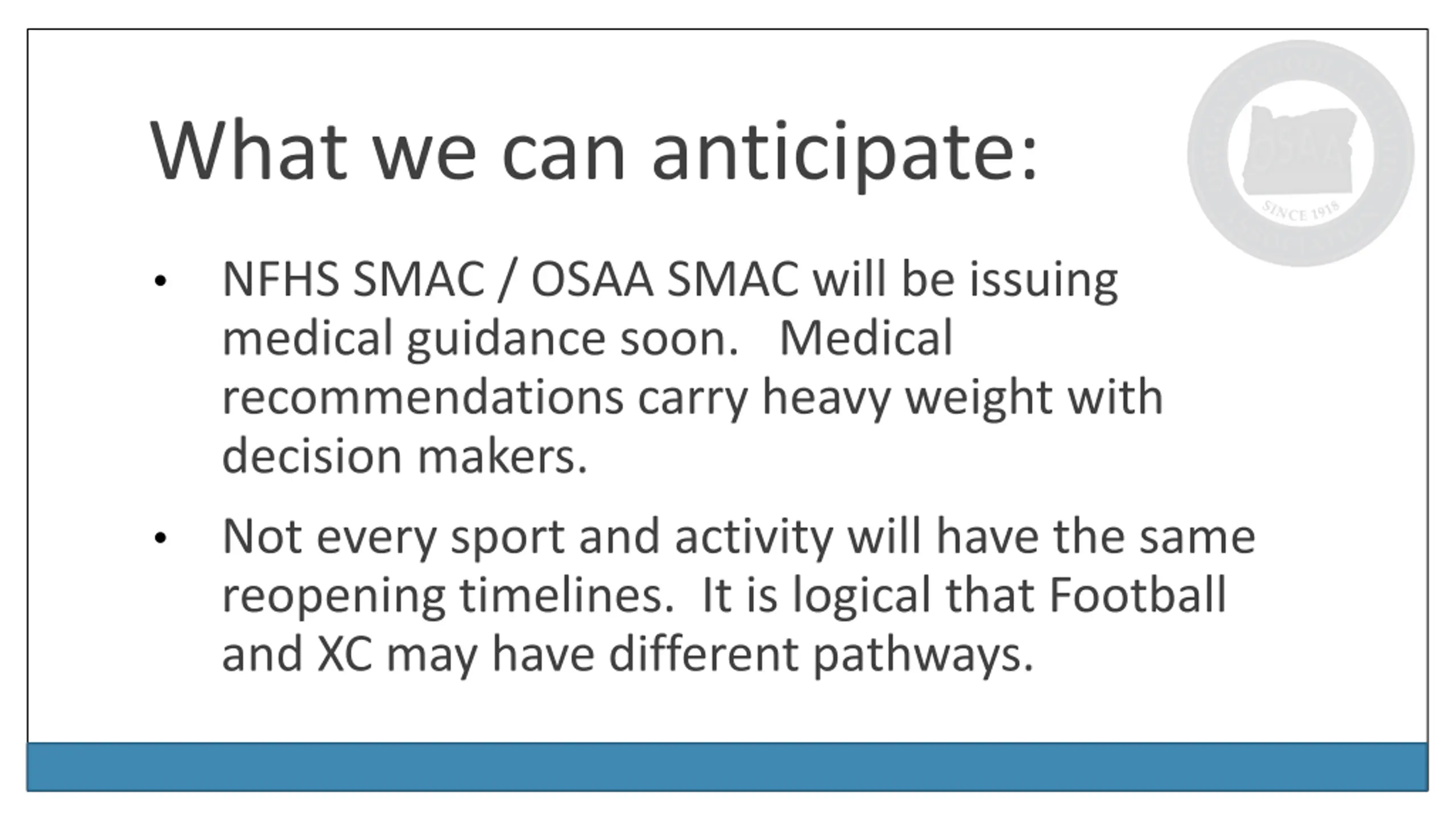 What we can anticipate: NFHS SMAC / OSAA SMAC will be issuing medical guidance soon. Medical recommendations carry heavy weight with decision makers. Not every sport and activity will have the same reopening timelines. It is logical that Football and XC may have different pathways.