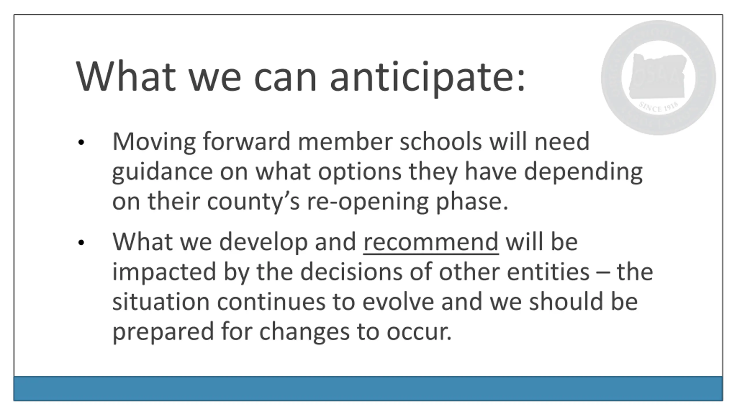 What we can anticipate: Moving forward member schools will need guidance on what options they have depending on their county s re-opening phase. What we develop and recommend will be impacted by the decisions of other entities the situation continues to evolve and we should be prepared for changes to occur.