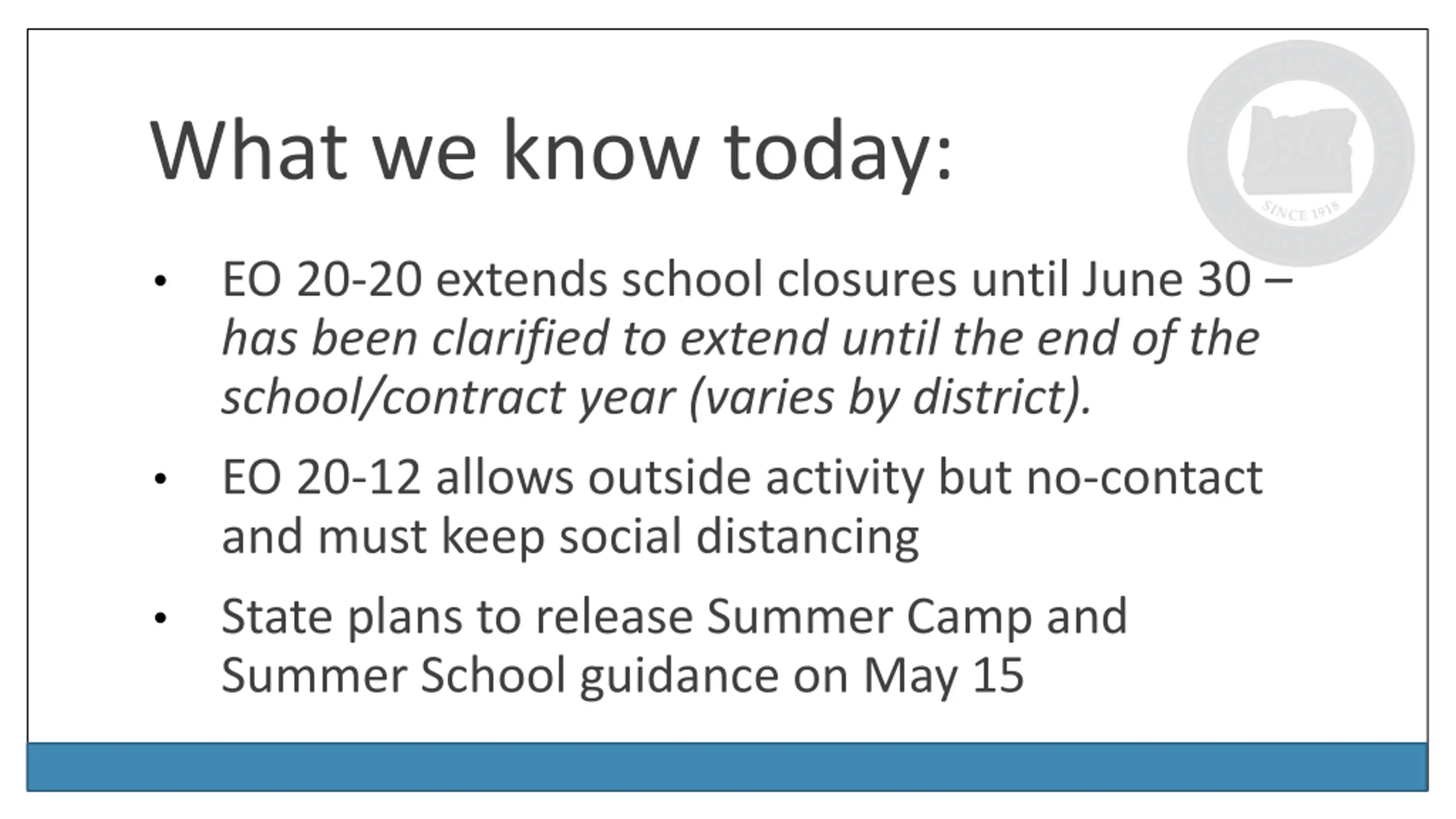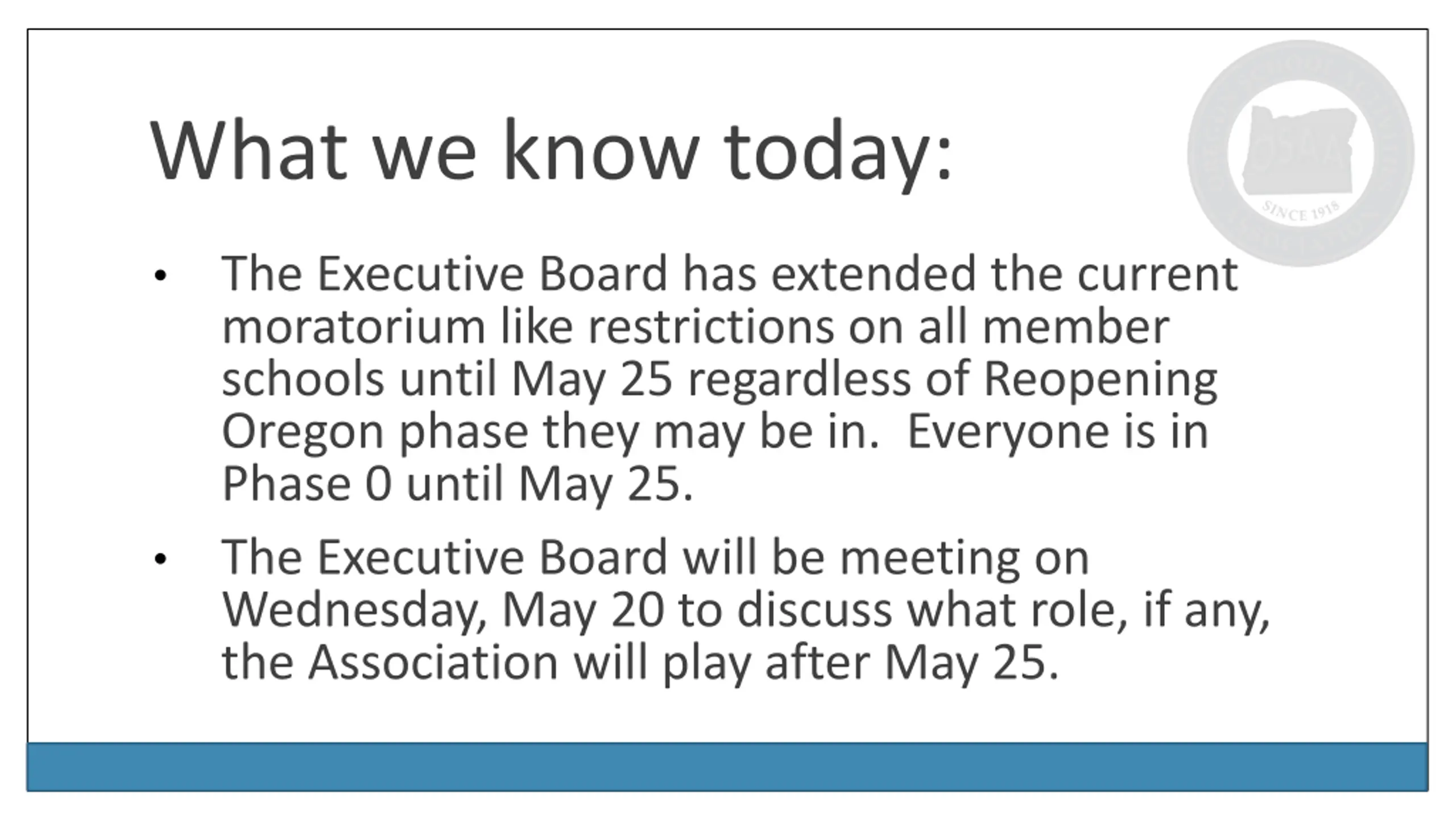What we know today: The Executive Board has extended the current moratorium like restrictions on all member schools until May 25 regardless of Reopening Oregon phase they may be in. Everyone is in Phase 0 until May 25. The Executive Board will be meeting on Wednesday, May 20 to discuss what role, if any, the Association will play after May 25.