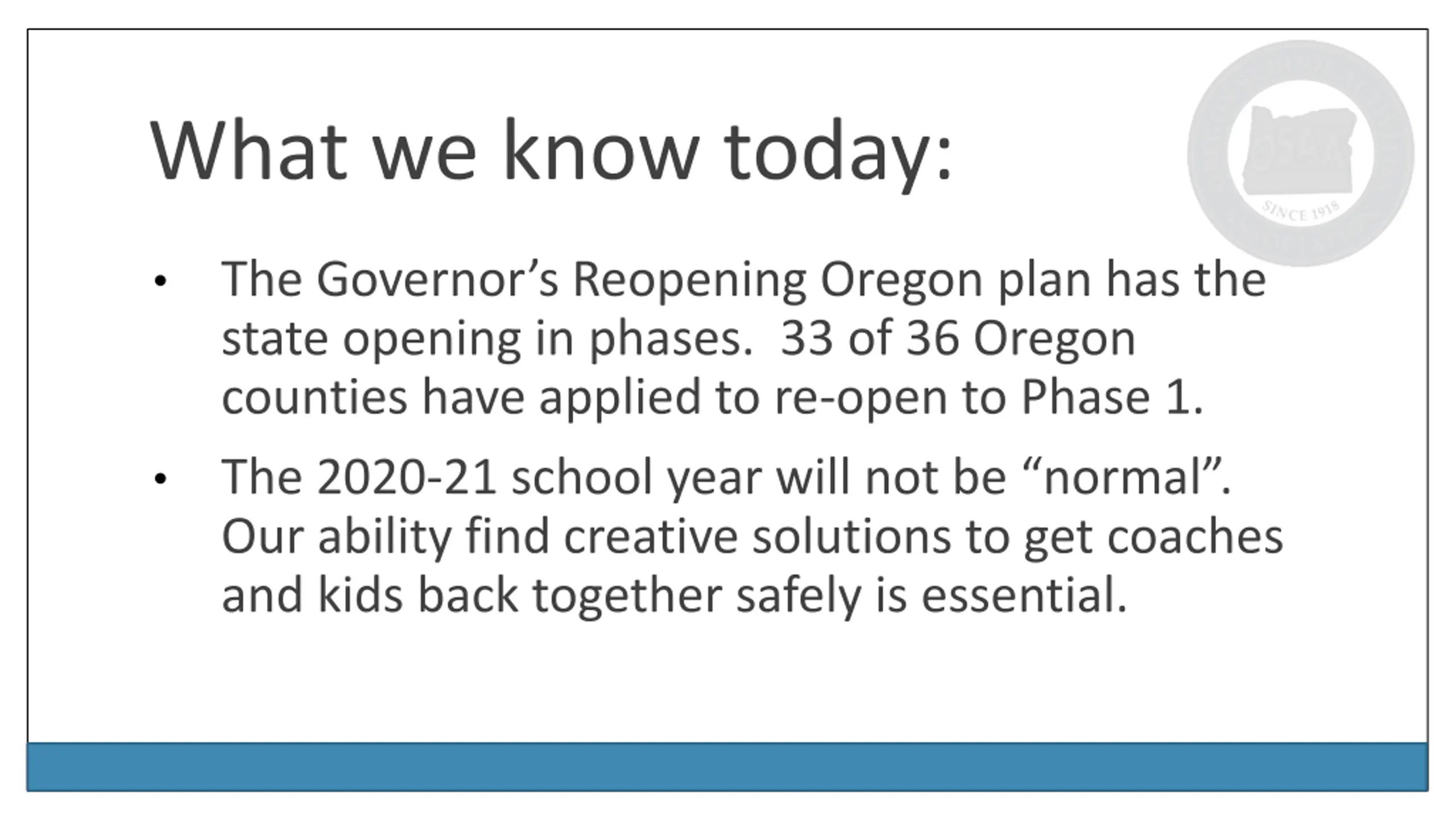What we know today: The Governor s Reopening Oregon plan has the state opening in phases. 33 of 36 Oregon counties have applied to re-open to Phase 1. The 2020-21 school year will not be normal . Our ability find creative solutions to get coaches and kids back together safely is essential.