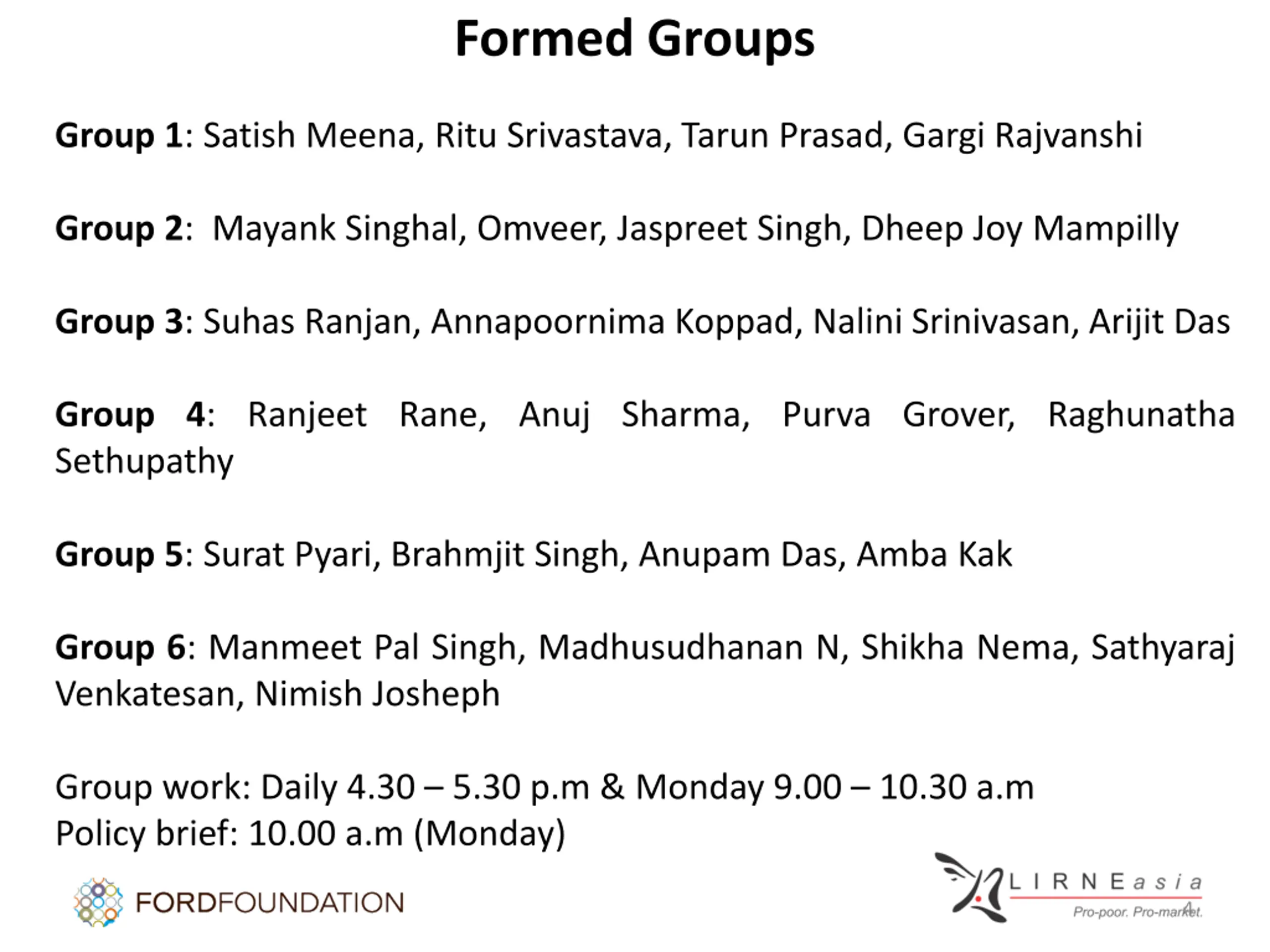- Formed Groups Group 1: Satish Meena, Ritu Srivastava, Tarun Prasad, Gargi Rajvanshi Group 2: Mayank Singhal, Omveer, Jaspreet Singh, Dheep Joy Mampilly Group 3: Suhas Ranjan, Annapoornima Koppad, Nalini Srinivasan, Arijit Das Group 4: Ranjeet Rane, Anuj Sharma, Purva Grover, Raghunatha Sethupathy Group 5: Surat Pyari, Brahmjit Singh, Anupam Das, Amba Kak Group 6: Manmeet Pal Singh, Madhusudhanan N, Shikha Nema, Sathyaraj Venkatesan, Nimish Josheph Group work: Daily 4.30 5.30 p.m & Monday 9.00 10.30 a.m Policy brief: 10.00 a.m (Monday) 4