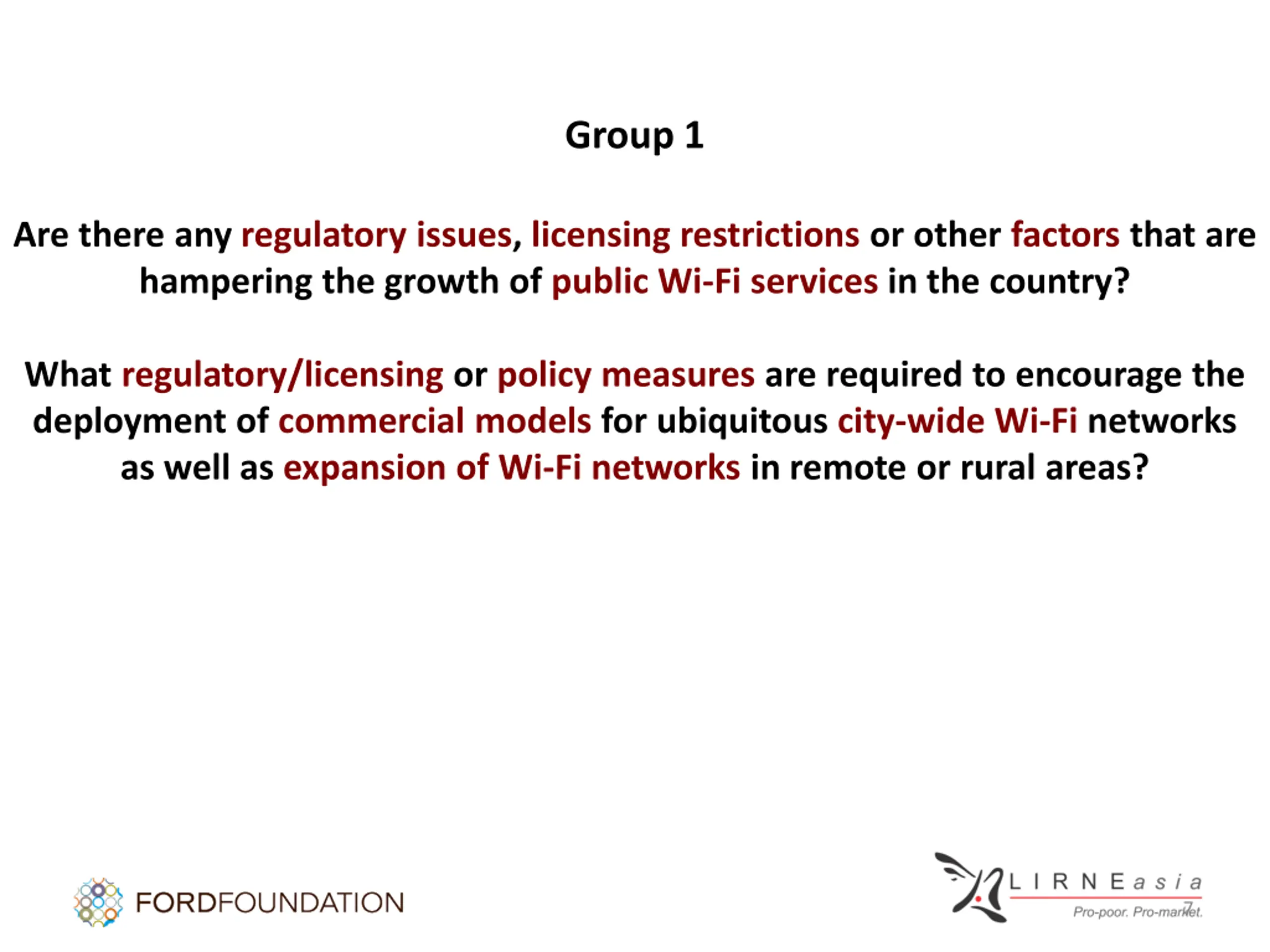 - Group 1 Are there any regulatory issues, licensing restrictions or other factors that are hampering the growth of public Wi-Fi services in the country? What regulatory/licensing or policy measures are required to encourage the deployment of commercial models for ubiquitous city-wide Wi-Fi networks as well as expansion of Wi-Fi networks in remote or rural areas? 7