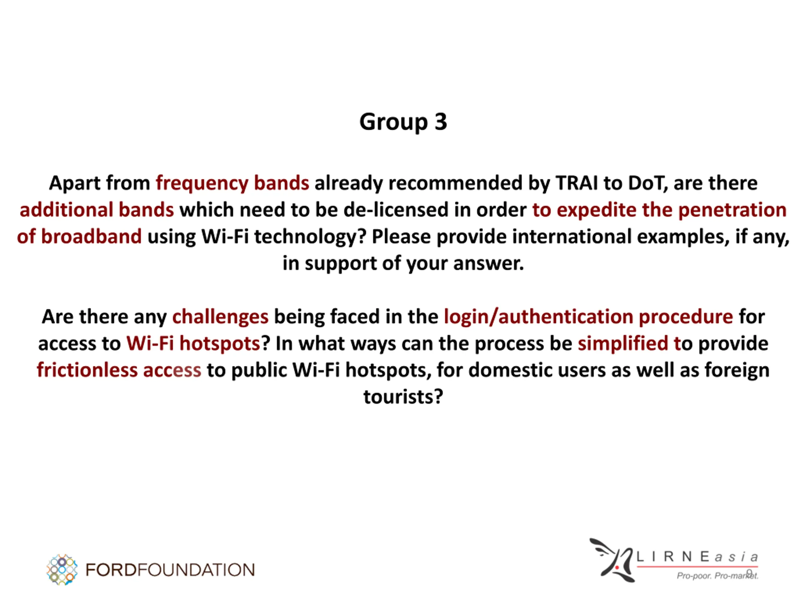 - Group 3 Apart from frequency bands already recommended by TRAI to DoT, are there additional bands which need to be de-licensed in order to expedite the penetration of broadband using Wi-Fi technology? Please provide international examples, if any, in support of your answer. Are there any challenges being faced in the login/authentication procedure for access to Wi-Fi hotspots? In what ways can the process be simplified to provide frictionless access to public Wi-Fi hotspots, for domestic users as well as foreign tourists? 9