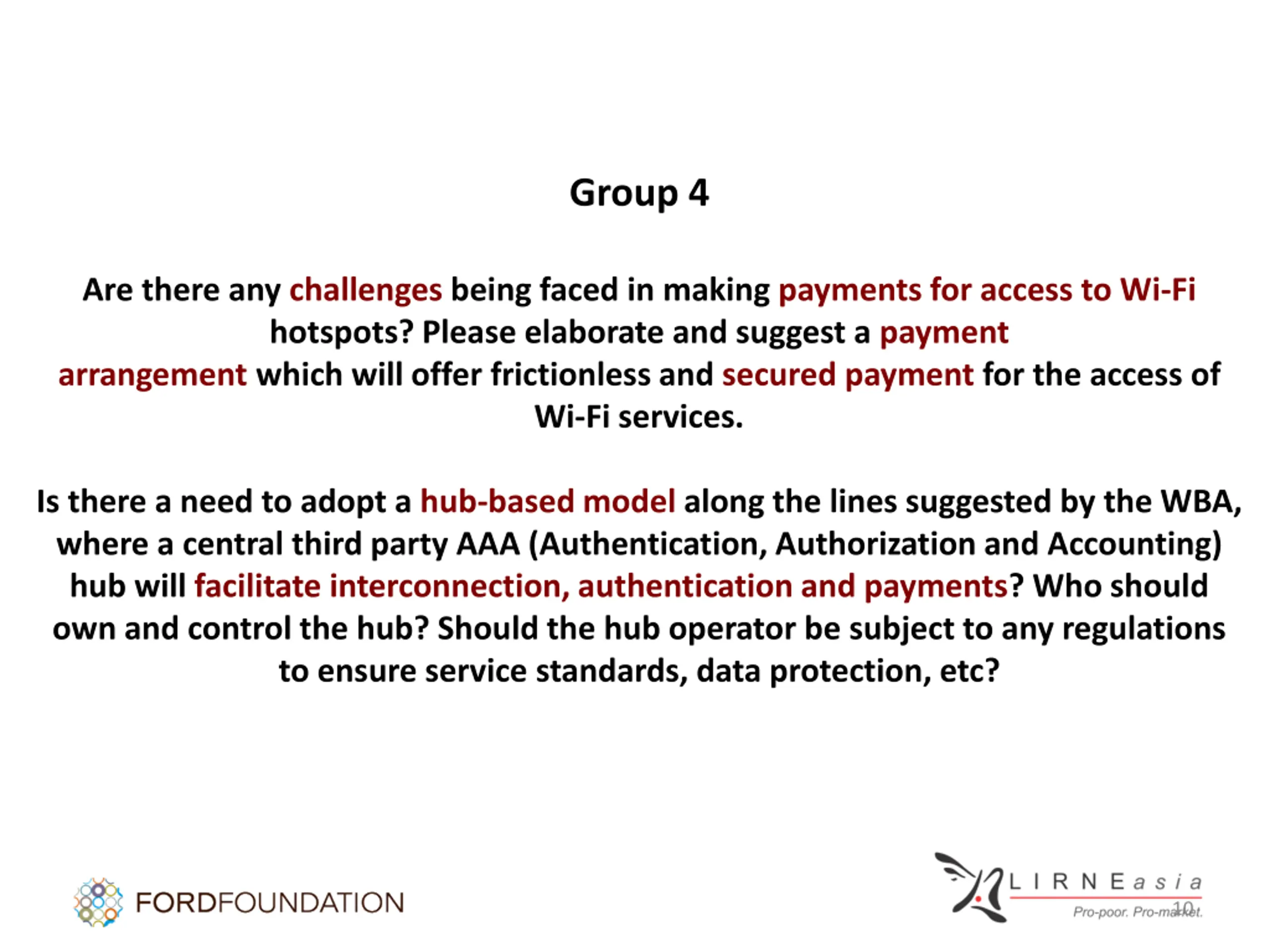 - Group 4 Are there any challenges being faced in making payments for access to Wi-Fi hotspots? Please elaborate and suggest a payment arrangement which will offer frictionless and secured payment for the access of Wi-Fi services. Is there a need to adopt a hub-based model along the lines suggested by the WBA, where a central third party AAA (Authentication, Authorization and Accounting) hub will facilitate interconnection, authentication and payments? Who should own and control the hub? Should the hub operator be subject to any regulations to ensure service standards, data protection, etc? 10