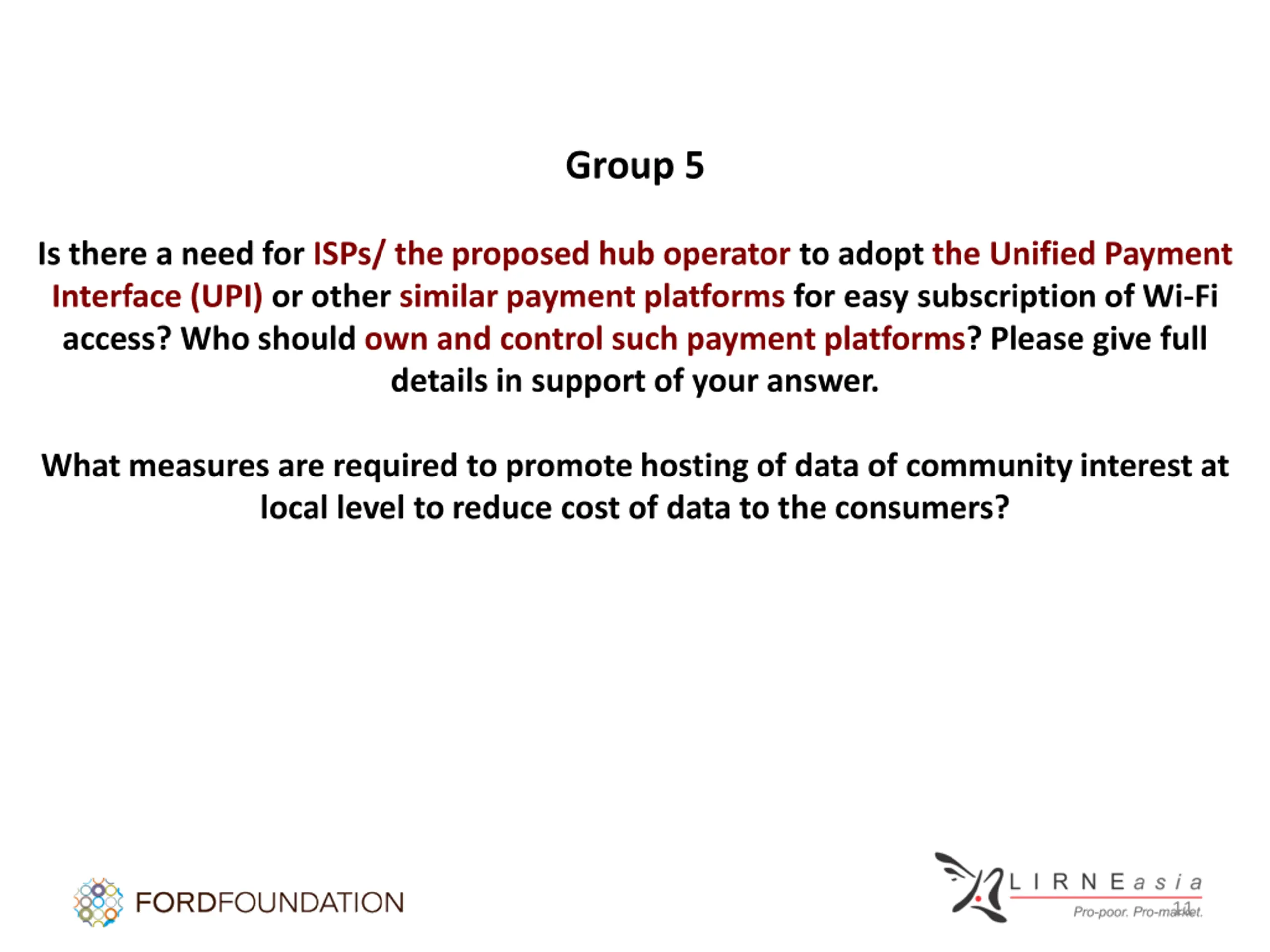 - Group 5 Is there a need for ISPs/ the proposed hub operator to adopt the Unified Payment Interface (UPI) or other similar payment platforms for easy subscription of Wi-Fi access? Who should own and control such payment platforms? Please give full details in support of your answer. What measures are required to promote hosting of data of community interest at local level to reduce cost of data to the consumers? 11