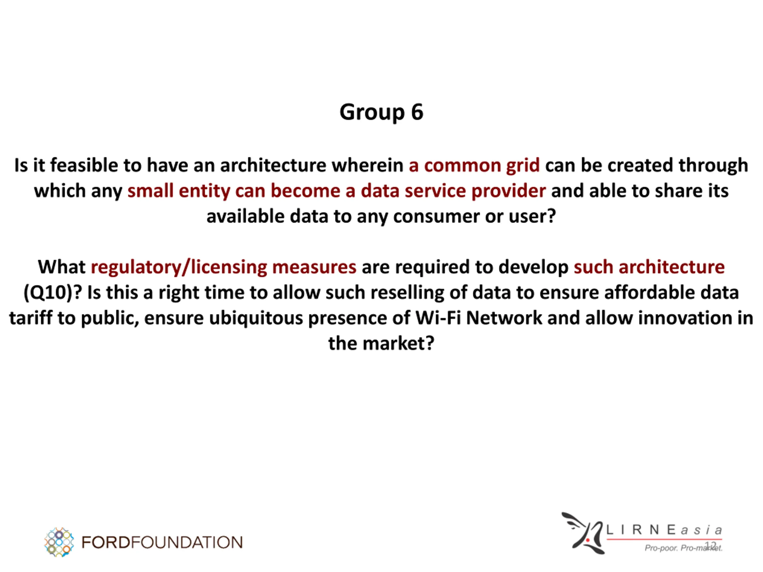 - Group 6 Is it feasible to have an architecture wherein a common grid can be created through which any small entity can become a data service provider and able to share its available data to any consumer or user? What regulatory/licensing measures are required to develop such architecture (Q10)? Is this a right time to allow such reselling of data to ensure affordable data tariff to public, ensure ubiquitous presence of Wi-Fi Network and allow innovation in the market? 12