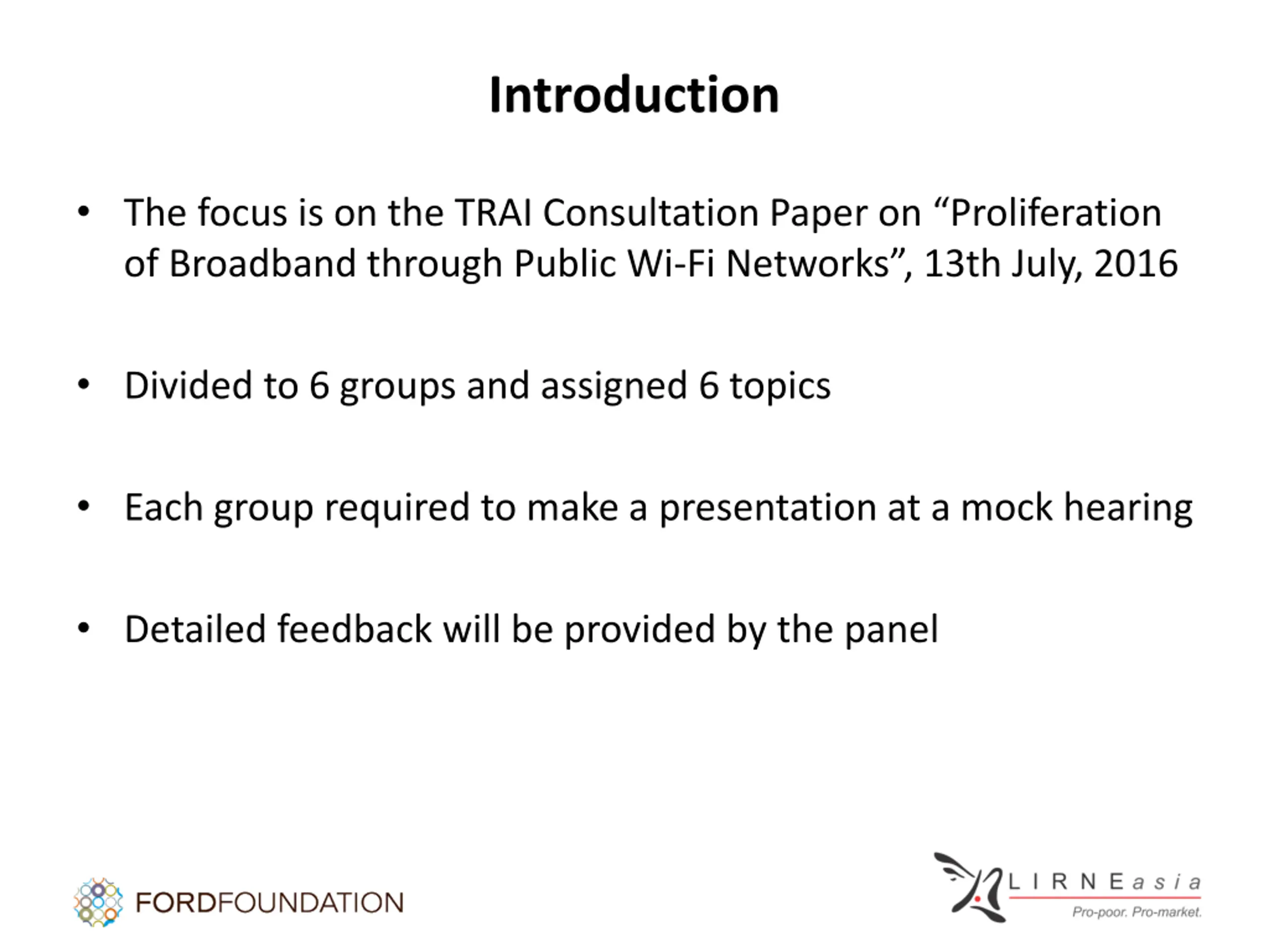 - Introduction The focus is on the TRAI Consultation Paper on Proliferation of Broadband through Public Wi-Fi Networks , 13th July, 2016 Divided to 6 groups and assigned 6 topics Each group required to make a presentation at a mock hearing Detailed feedback will be provided by the panel