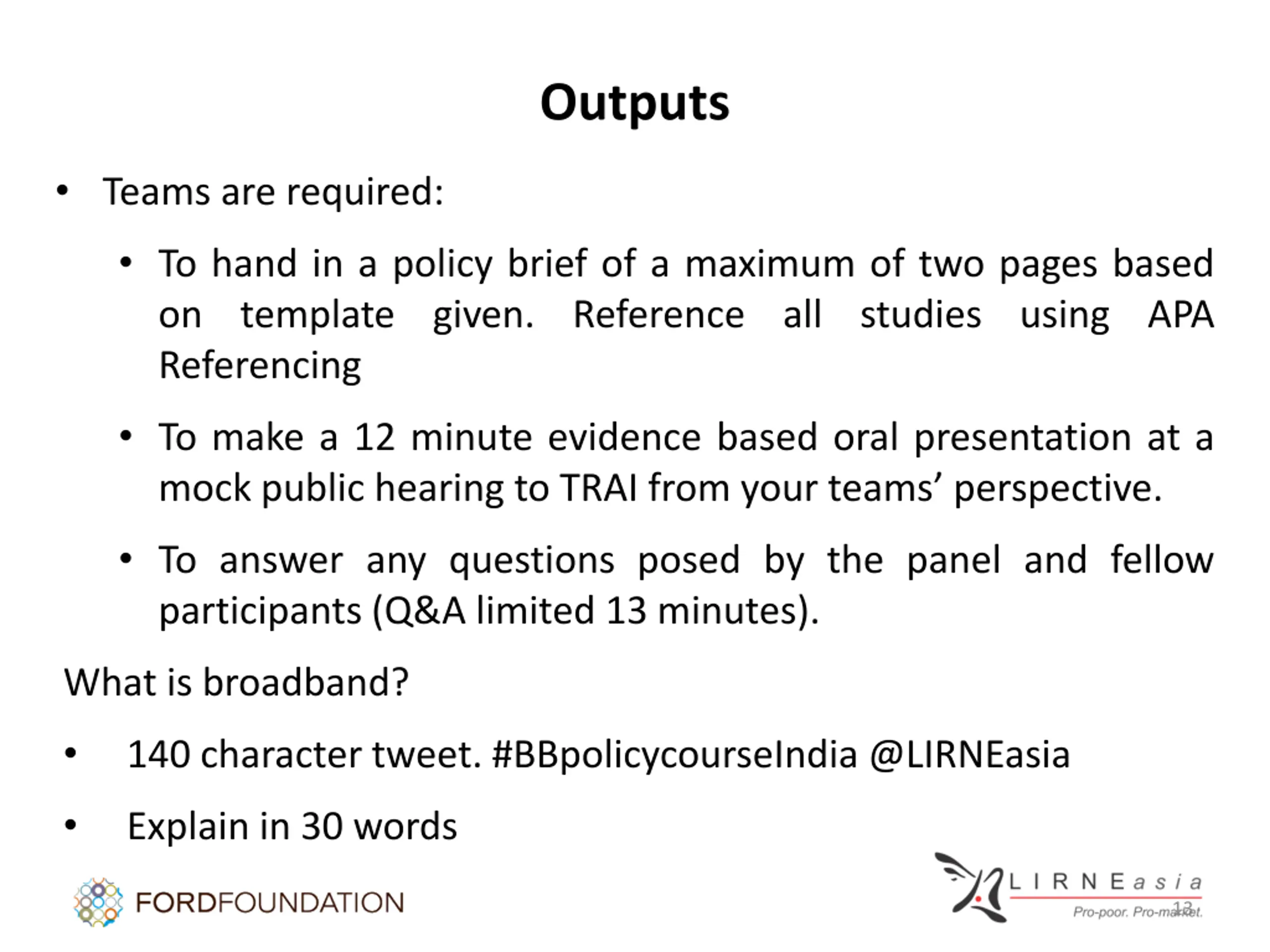 - Outputs Teams are required: To hand in a policy brief of a maximum of two pages based on template given. Reference all studies using APA Referencing To make a 12 minute evidence based oral presentation at a mock public hearing to TRAI from your teams perspective. To answer any questions posed by the panel and fellow participants (Q&A limited 13 minutes). What is broadband? 140 character tweet. #BBpolicycourseIndia @LIRNEasia Explain in 30 words 13