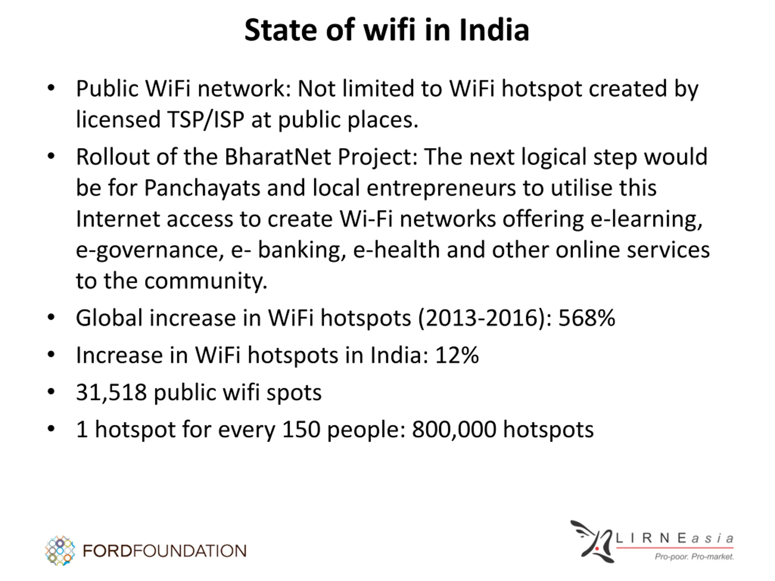 - State of wifi in India Public WiFi network: Not limited to WiFi hotspot created by licensed TSP/ISP at public places. Rollout of the BharatNet Project: The next logical step would be for Panchayats and local entrepreneurs to utilise this Internet access to create Wi-Fi networks offering e-learning, e-governance, e- banking, e-health and other online services to the community. Global increase in WiFi hotspots (2013-2016): 568% Increase in WiFi hotspots in India: 12% 31,518 public wifi spots 1 hotspot for every 150 people: 800,000 hotspots