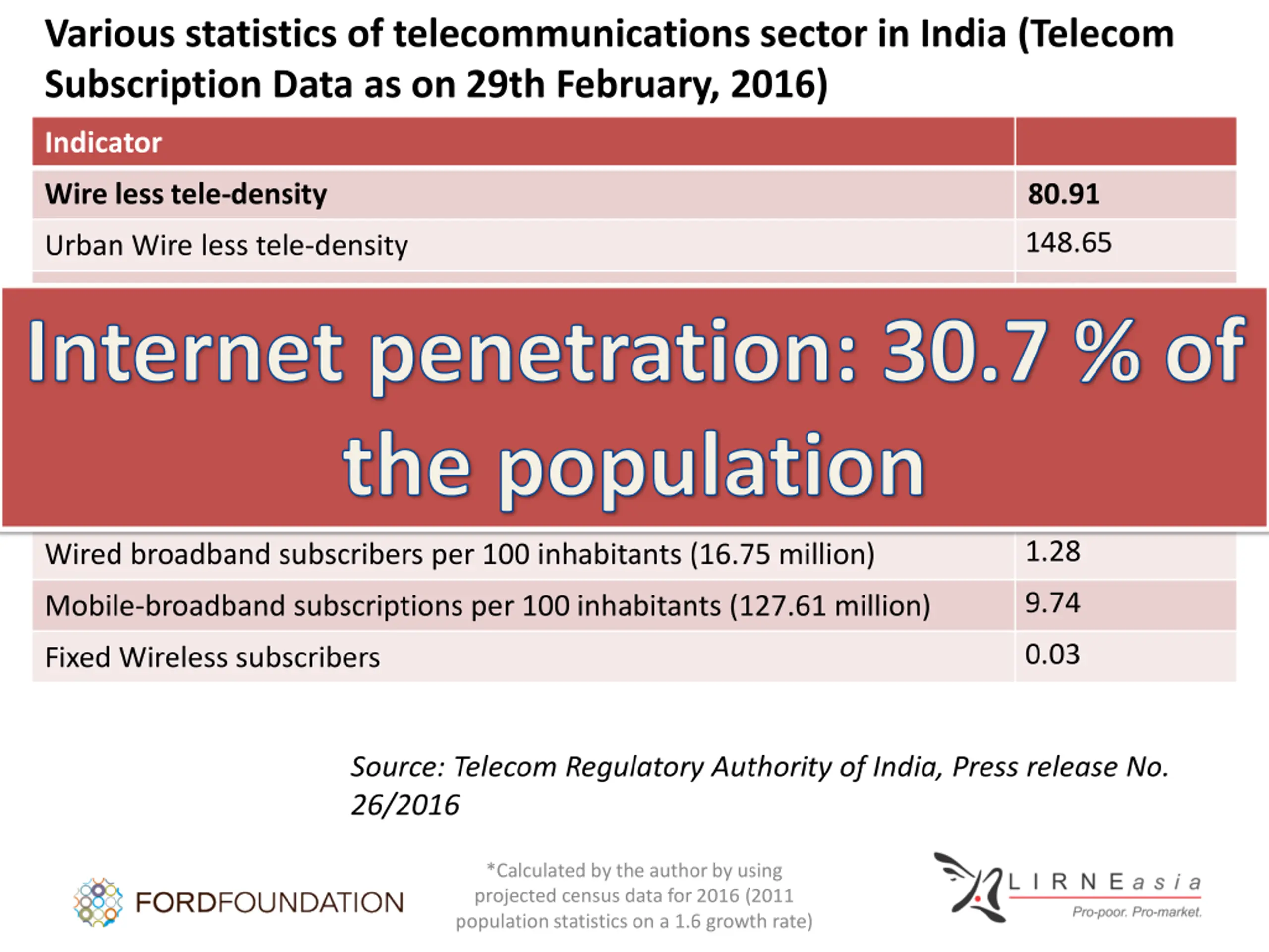 - Various statistics of telecommunications sector in India (Telecom Subscription Data as on 29th February, 2016) Indicator Wire less tele-density 80.91 148.65 Urban Wire less tele-density Internet penetration: 30.7 % of the population 50.26 Rural Wire less tele-density 1.99 Wire line tele-density 5.28 Urban Wire line tele-density 0.50 Rural Wire line tele-density Broadband subscriptions per 100 inhabitants (144.87million) 11.05* 1.28 Wired broadband subscribers per 100 inhabitants (16.75 million) 9.74 Mobile-broadband subscriptions per 100 inhabitants (127.61 million) 0.03 Fixed Wireless subscribers Source:Telecom Regulatory Authority of India, Press release No. 26/2016 *Calculated by the author by using projected census data for 2016 (2011 population statistics on a 1.6 growth rate)