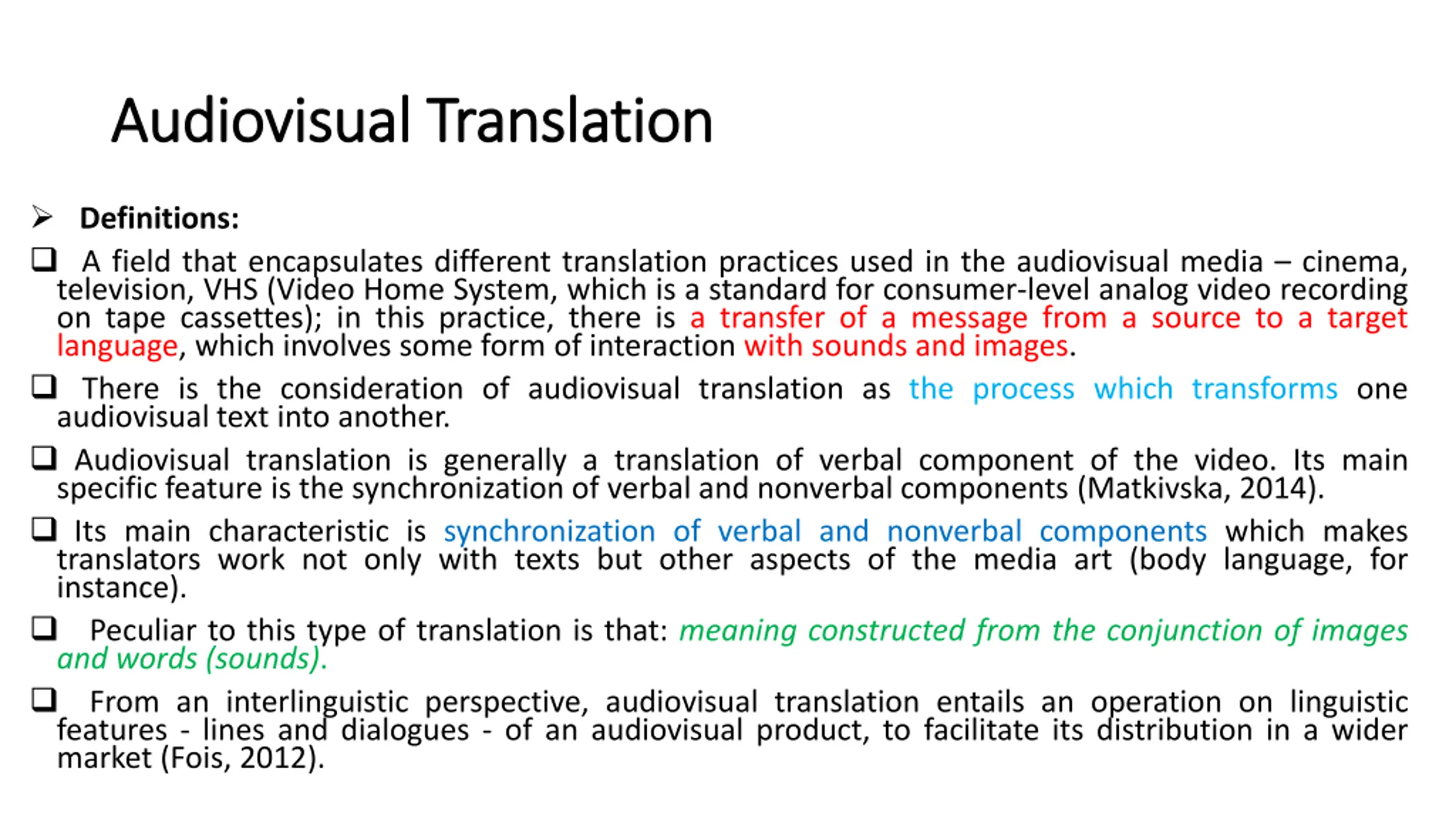 Audiovisual Translation Audiovisual Translation Definitions: A field that encapsulates different translation practices used in the audiovisual media cinema, television, VHS (Video Home System, which is a standard for consumer-level analog video recording on tape cassettes); in this practice, there is a transfer of a message from a source to a target language, which involves some form of interaction with sounds and images. There is the consideration of audiovisual translation as the process which transforms one audiovisual text into another. Audiovisual translation is generally a translation of verbal component of the video. Its main specific feature is the synchronization of verbal and nonverbal components (Matkivska, 2014). Its main characteristic is synchronization of verbal and nonverbal components which makes translators work not only with texts but other aspects of the media art (body language, for instance). Peculiar to this type of translation is that: meaning constructed from the conjunction of images and words (sounds). From an interlinguistic perspective, audiovisual translation entails an operation on linguistic features - lines and dialogues - of an audiovisual product, to facilitate its distribution in a wider market (Fois, 2012).
