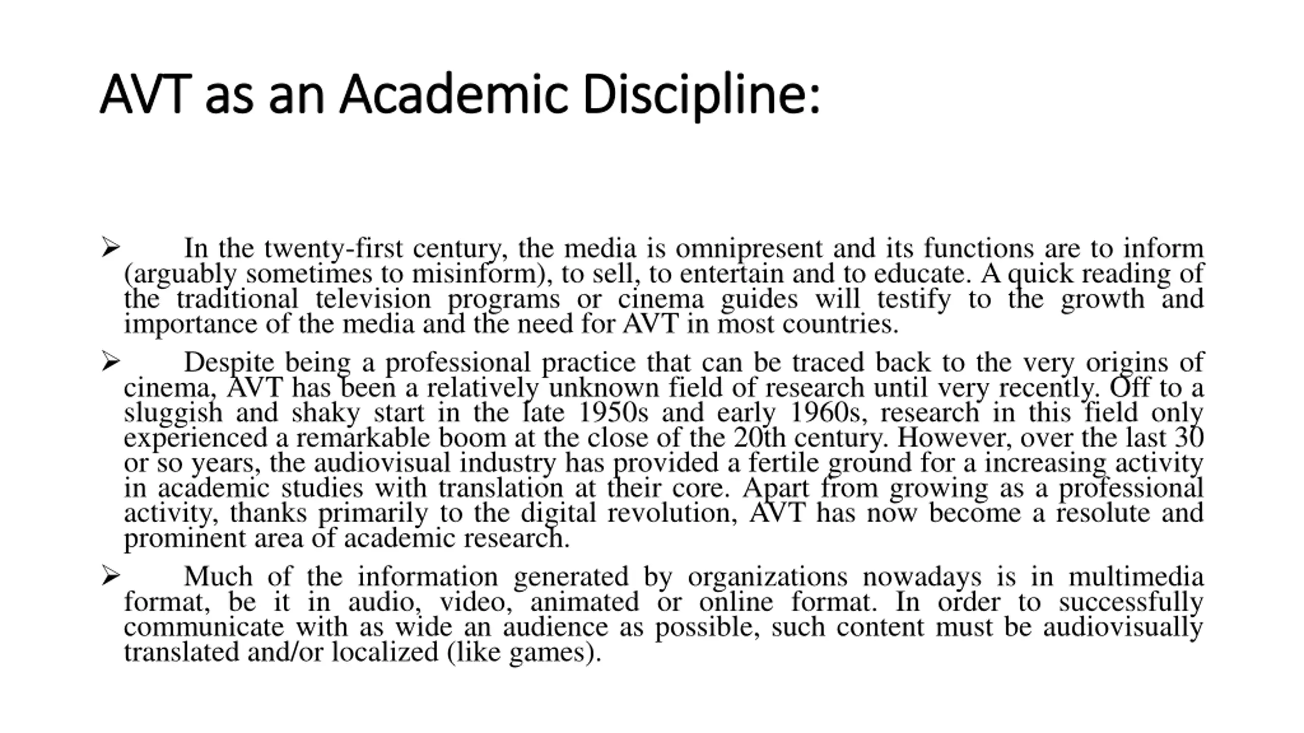 AVT as an Academic Discipline AVT as an Academic Discipline: : In the twenty-first century, the media is omnipresent and its functions are to inform (arguably sometimes to misinform), to sell, to entertain and to educate. A quick reading of the traditional television programs or cinema guides will testify to the growth and importance of the media and the need for AVT in most countries. Despite being a professional practice that can be traced back to the very origins of cinema, AVT has been a relatively unknown field of research until very recently. Off to a sluggish and shaky start in the late 1950s and early 1960s, research in this field only experienced a remarkable boom at the close of the 20th century. However, over the last 30 or so years, the audiovisual industry has provided a fertile ground for a increasing activity in academic studies with translation at their core. Apart from growing as a professional activity, thanks primarily to the digital revolution, AVT has now become a resolute and prominent area of academic research. Much of the information generated by organizations nowadays is in multimedia format, be it in audio, video, animated or online format. In order to successfully communicate with as wide an audience as possible, such content must be audiovisually translated and/or localized (like games).