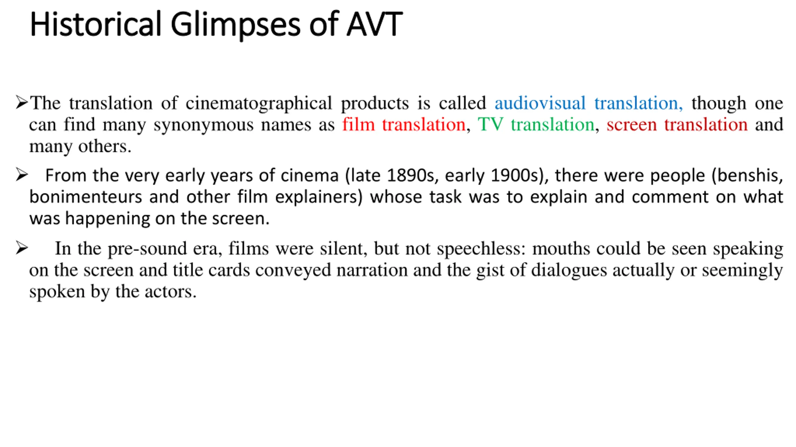 Historical Glimpses of AVT Historical Glimpses of AVT The translation of cinematographical products is called audiovisual translation, though one can find many synonymous names as film translation, TV translation, screen translation and many others. From the very early years of cinema (late 1890s, early 1900s), there were people (benshis, bonimenteurs and other film explainers) whose task was to explain and comment on what was happening on the screen. In the pre-sound era, films were silent, but not speechless: mouths could be seen speaking on the screen and title cards conveyed narration and the gist of dialogues actually or seemingly spoken by the actors.