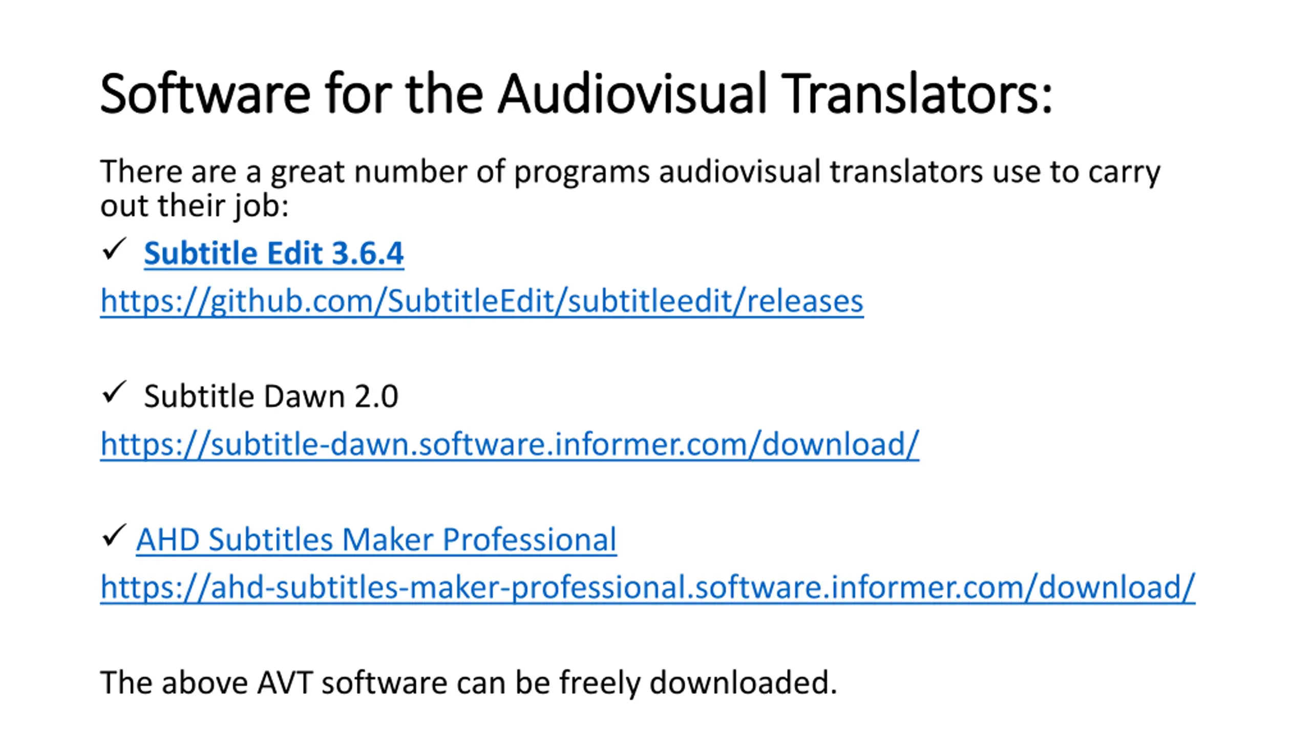 Software for the Audiovisual Translators: Software for the Audiovisual Translators: There are a great number of programs audiovisual translators use to carry out their job: Subtitle Edit 3.6.4 https://github.com/SubtitleEdit/subtitleedit/releases Subtitle Dawn 2.0 https://subtitle-dawn.software.informer.com/download/ AHD Subtitles Maker Professional https://ahd-subtitles-maker-professional.software.informer.com/download/ The above AVT software can be freely downloaded.