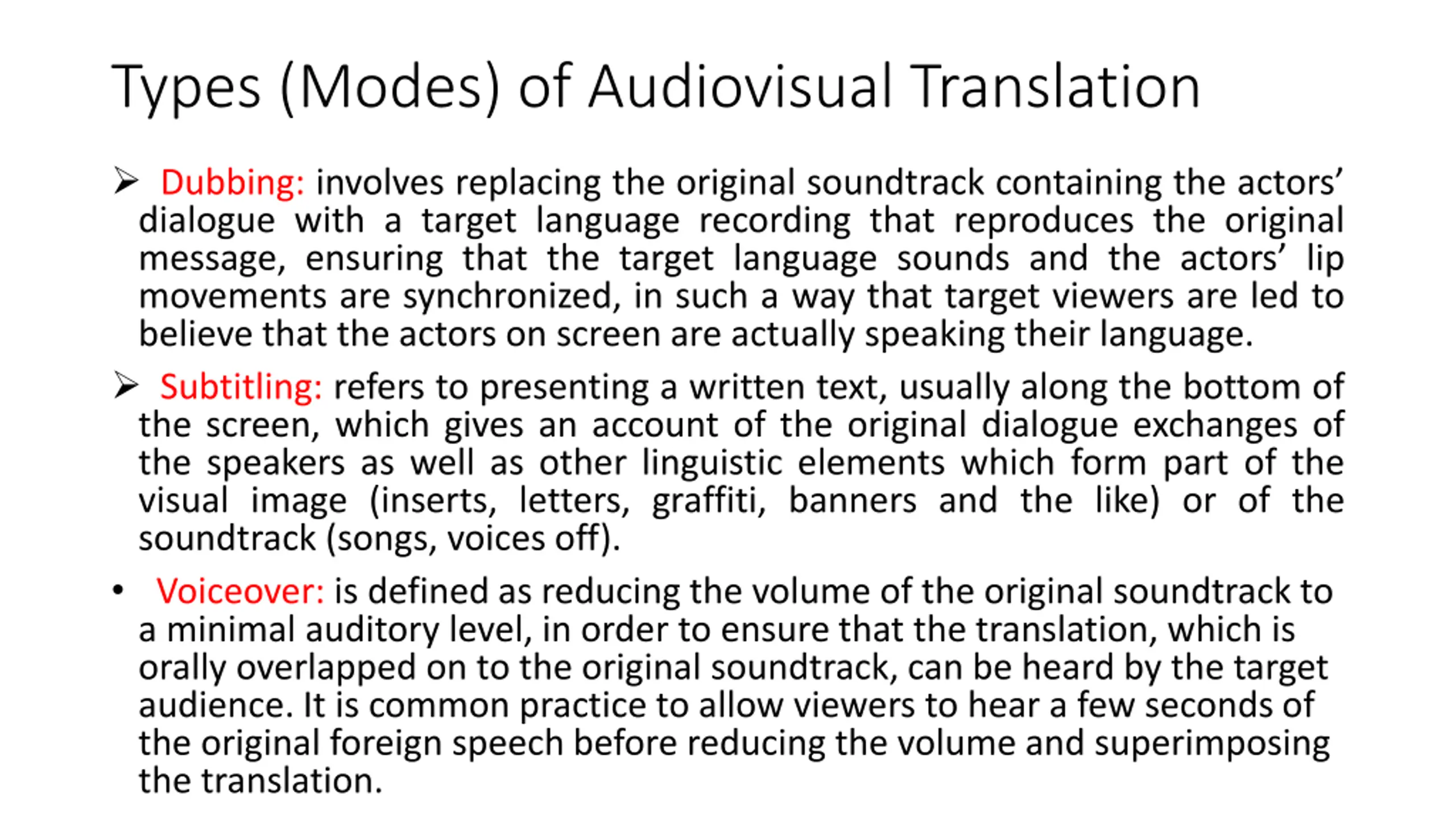 Types (Modes) of Audiovisual Translation Dubbing: involves replacing the original soundtrack containing the actors dialogue with a target language recording that reproduces the original message, ensuring that the target language sounds and the actors lip movements are synchronized, in such a way that target viewers are led to believe that the actors on screen are actually speaking their language. Subtitling: refers to presenting a written text, usually along the bottom of the screen, which gives an account of the original dialogue exchanges of the speakers as well as other linguistic elements which form part of the visual image (inserts, letters, graffiti, banners and the like) or of the soundtrack (songs, voices off). Voiceover: is defined as reducing the volume of the original soundtrack to a minimal auditory level, in order to ensure that the translation, which is orally overlapped on to the original soundtrack, can be heard by the target audience. It is common practice to allow viewers to hear a few seconds of the original foreign speech before reducing the volume and superimposing the translation.