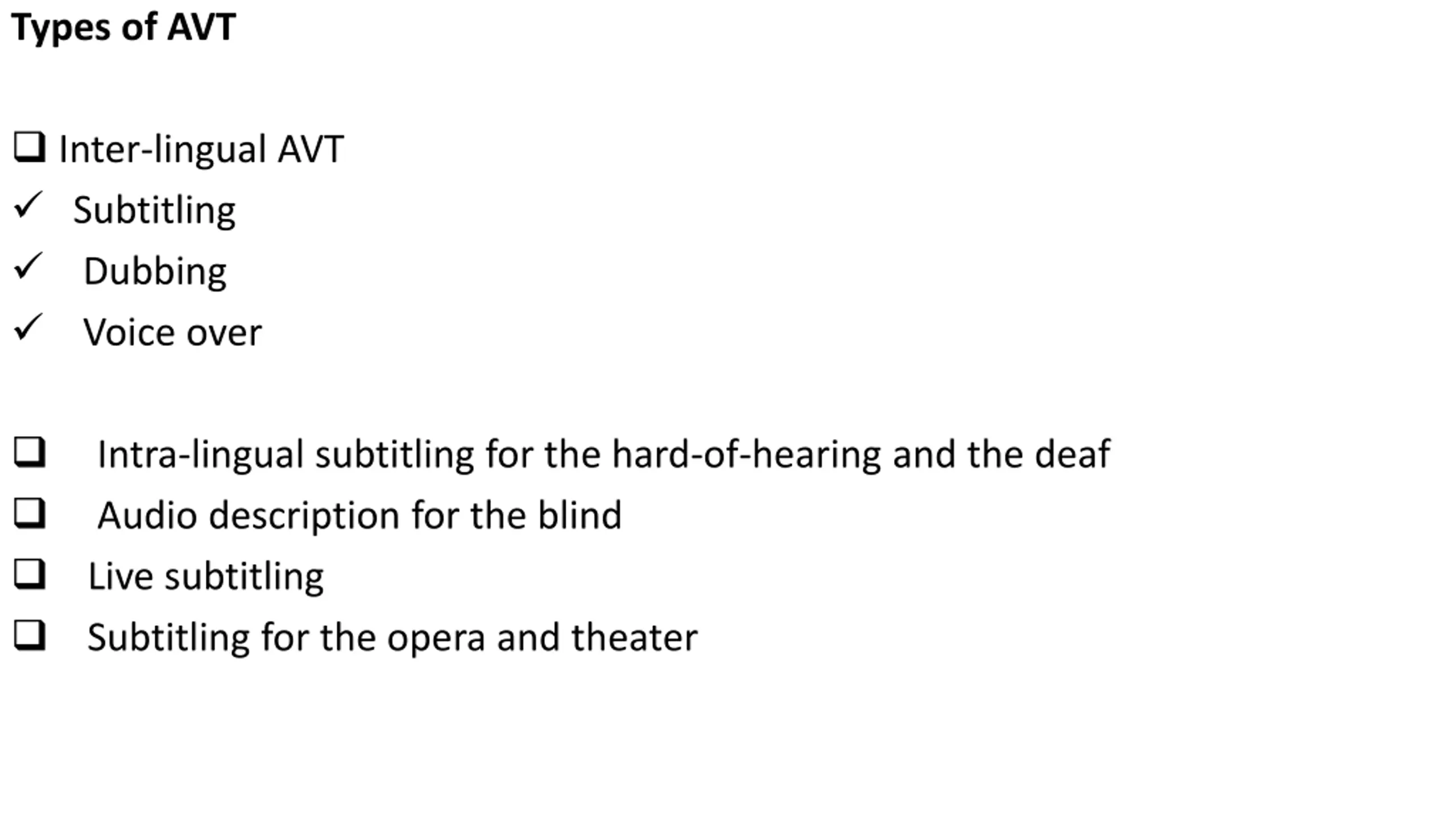 Types of AVT Inter-lingual AVT Subtitling Dubbing Voice over Intra-lingual subtitling for the hard-of-hearing and the deaf Audio description for the blind Live subtitling Subtitling for the opera and theater