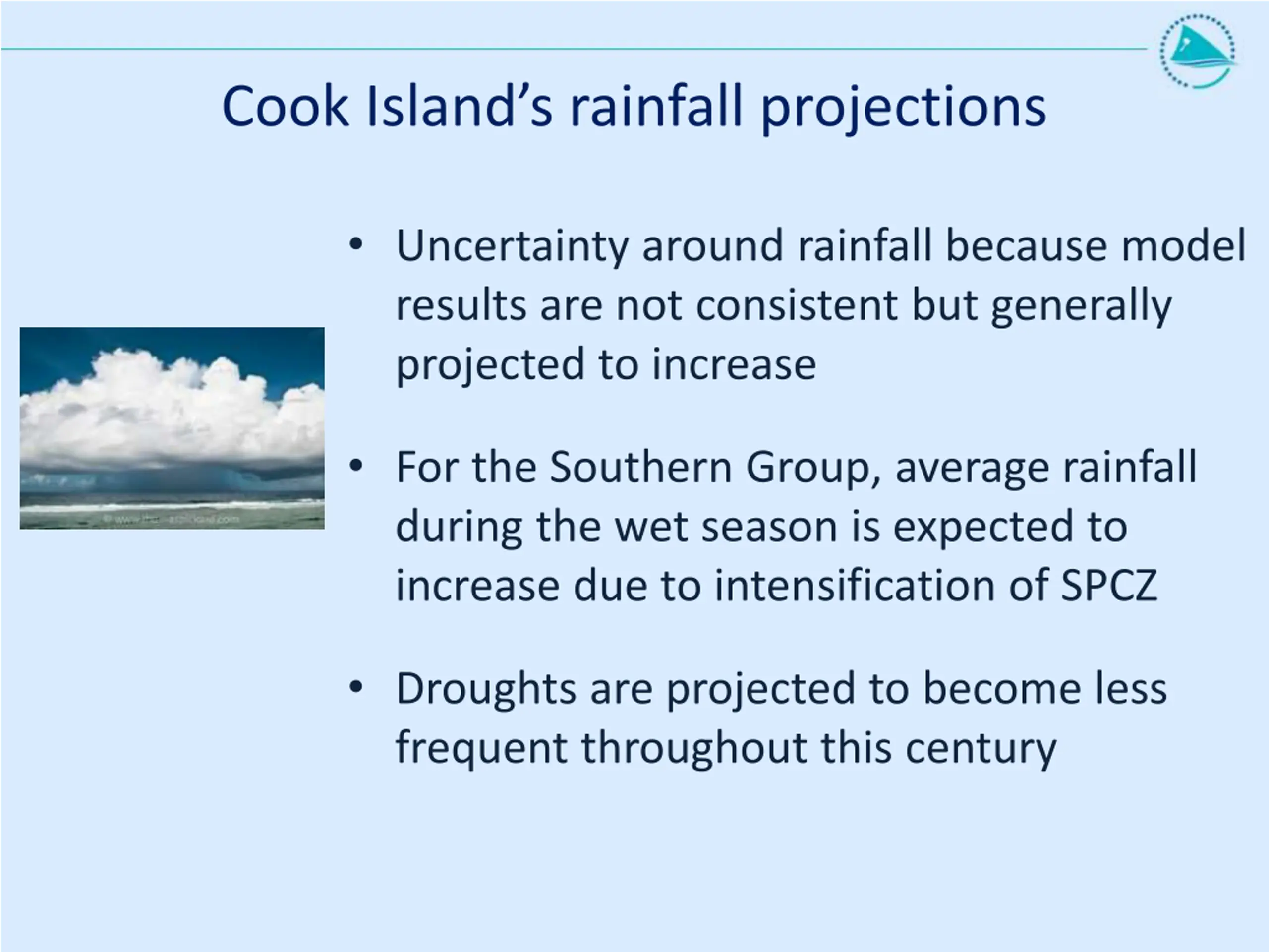 Cook Islands rainfall projections Uncertainty around rainfall because model results are not consistent but generally projected to increase For the Southern Group, average rainfall during the wet season is expected to increase due to intensification of SPCZ Droughts are projected to become less frequent throughout this century