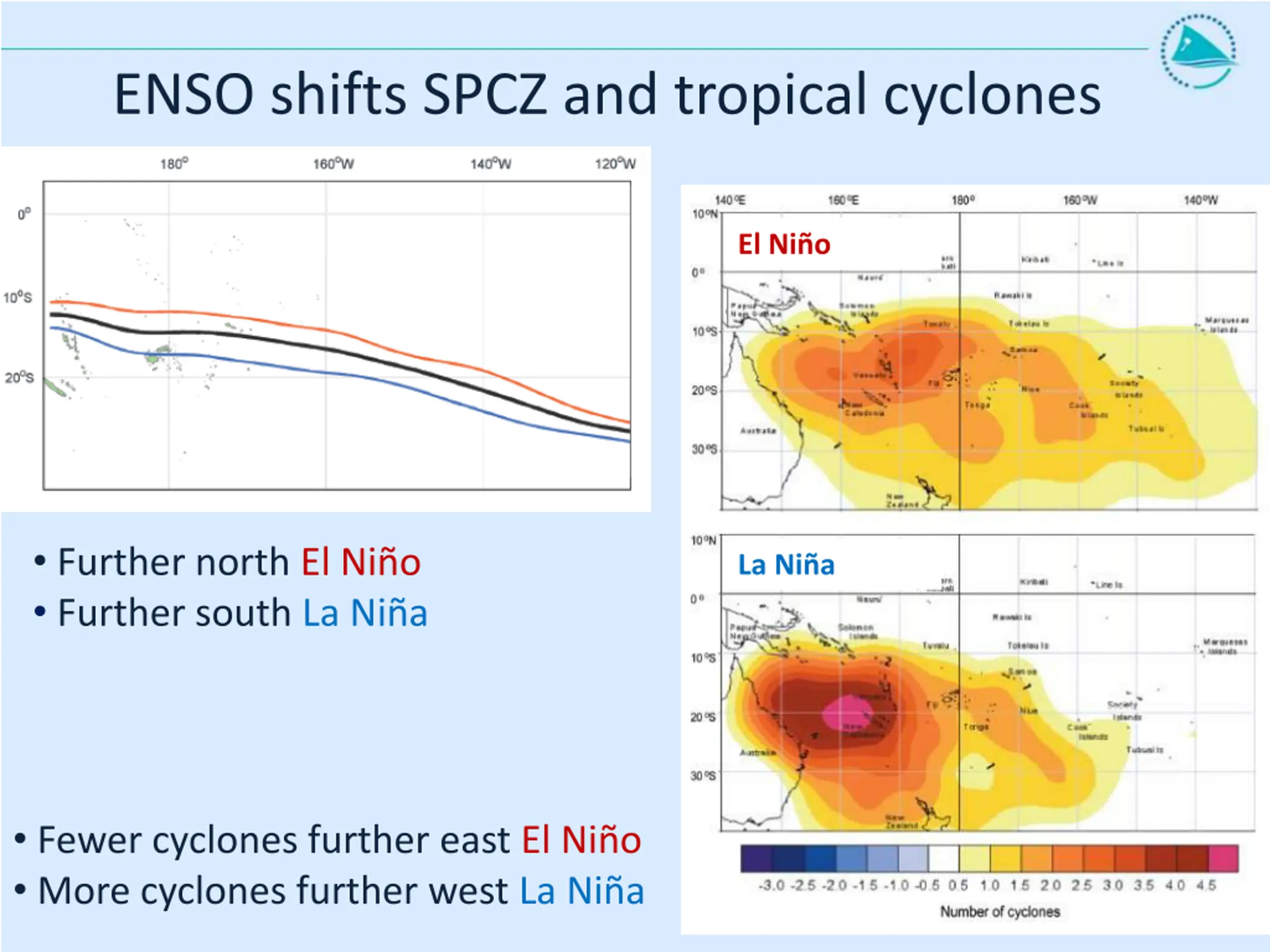 ENSO shifts SPCZ and tropical cyclones El Ni o Further north El Ni o Further south La Ni a La Ni a Fewer cyclones further east El Ni o More cyclones further west La Ni a