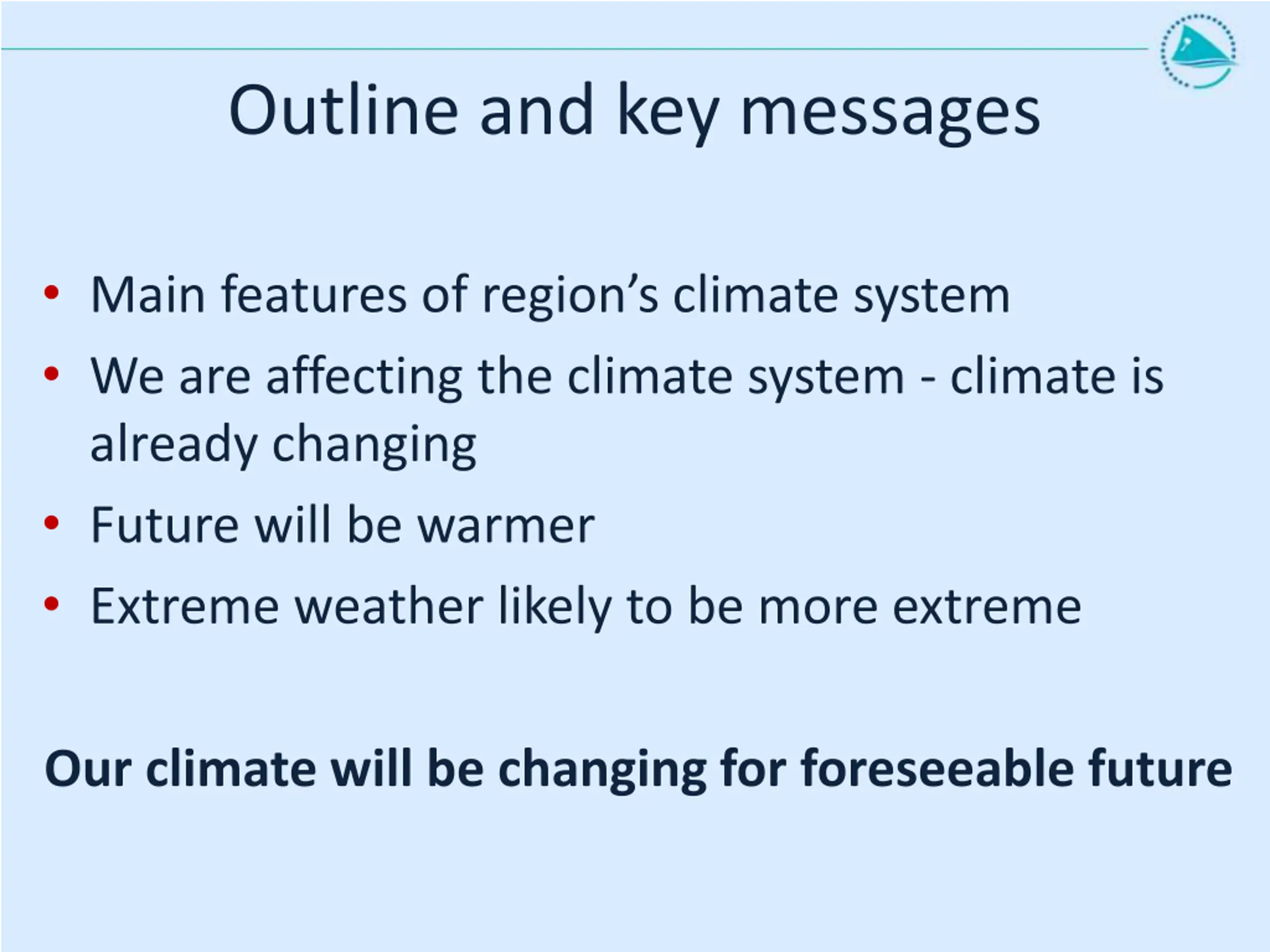 Outline and key messages Main features of region s climate system We are affecting the climate system - climate is already changing Future will be warmer Extreme weather likely to be more extreme Our climate will be changing for foreseeable future