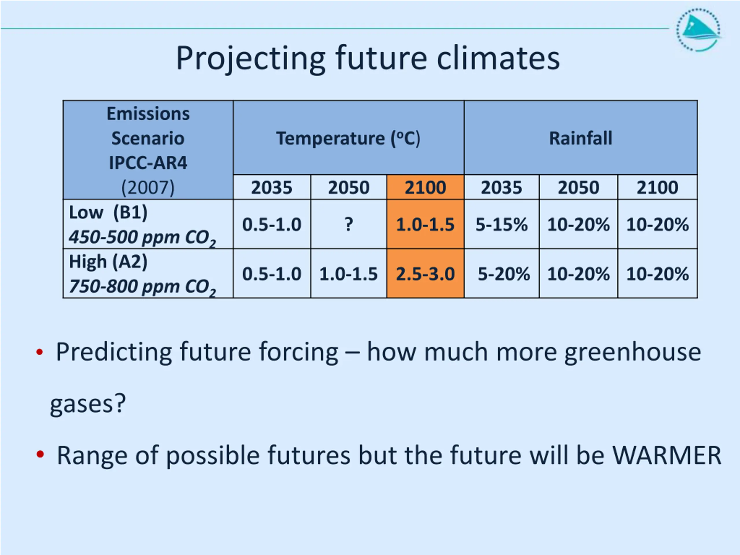 Projecting future climates Emissions Scenario IPCC-AR4 (2007) Low (B1) 450-500 ppm CO2 High (A2) 750-800 ppm CO2 Temperature (oC) Rainfall 2035 2050 2100 2035 2050 2100 0.5-1.0 ? 1.0-1.5 5-15% 10-20% 10-20% 0.5-1.0 1.0-1.5 2.5-3.0 5-20% 10-20% 10-20% Predicting future forcing how much more greenhouse gases? Range of possible futures but the future will be WARMER
