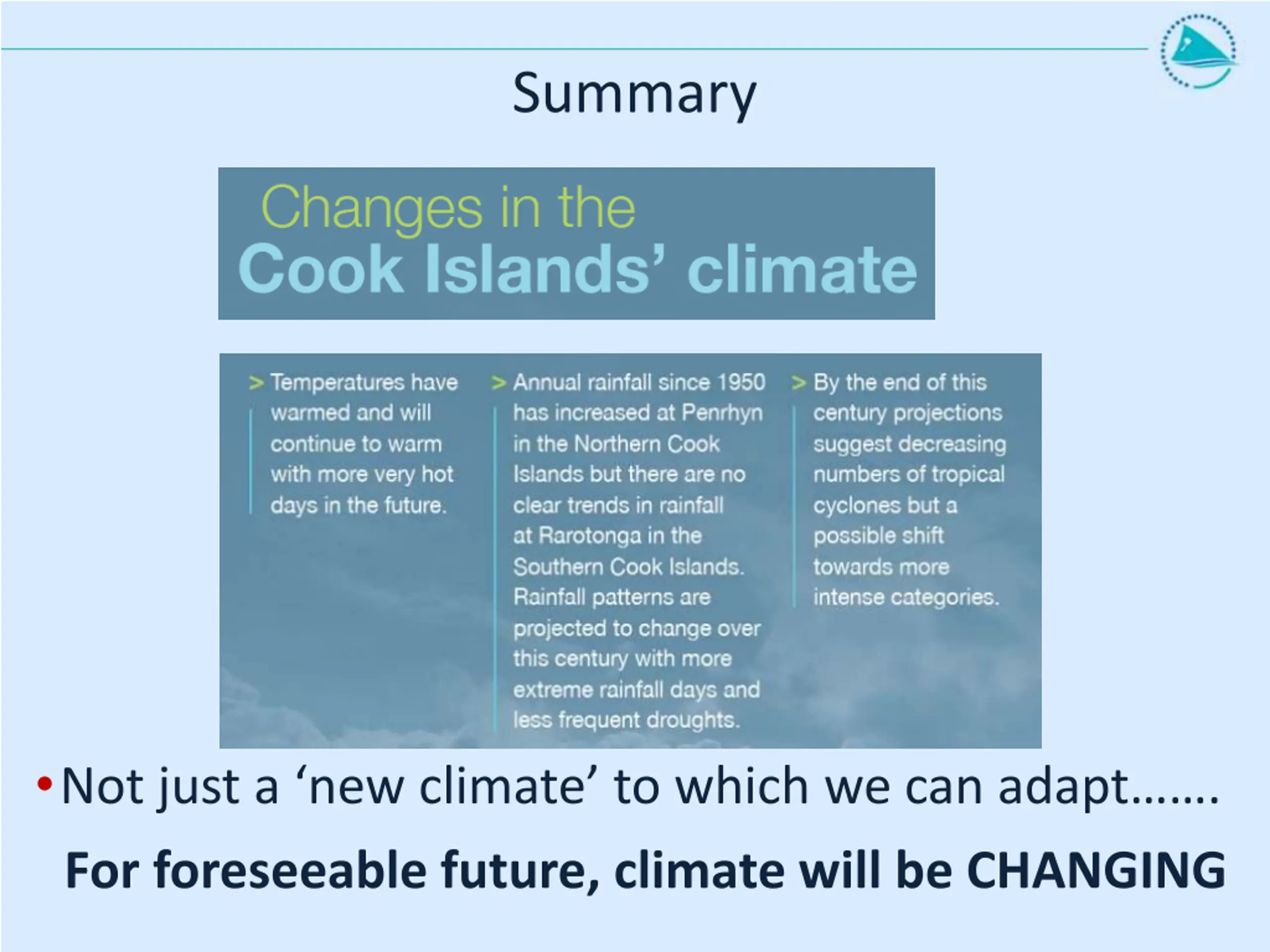 Cook Islands temperature projections Northern Group - increase in temperature of 0.5 0.9oC Southern Group - increase in temperature of 0.4 1.0oC More hot days and warm nights Decline in cooler weather.