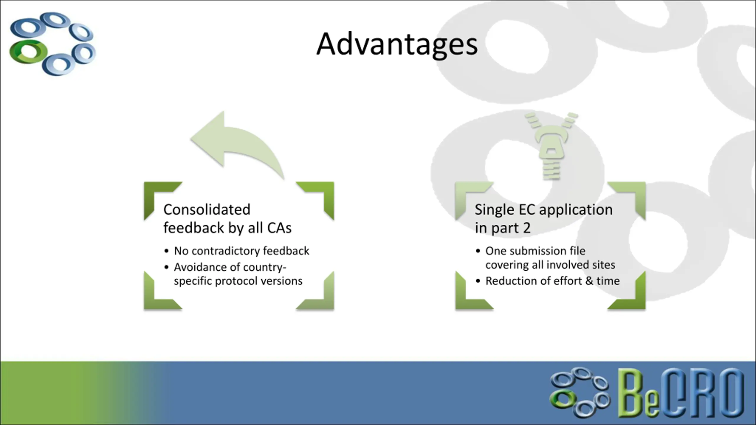Advantages Consolidated feedback by all CAs Single EC application in part 2 No contradictory feedback Avoidance of country- specific protocol versions One submission file covering all involved sites Reduction of effort & time