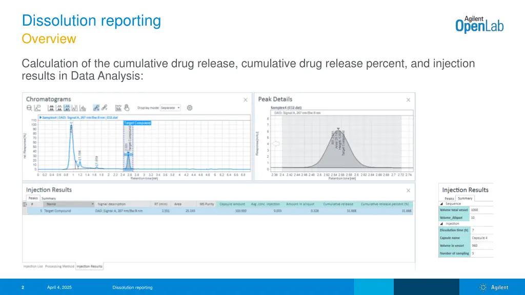 Dissolution reporting Overview Calculation of the cumulative drug release, cumulative drug release percent, and injection results in Data Analysis: April 4, 2025 Dissolution reporting 2