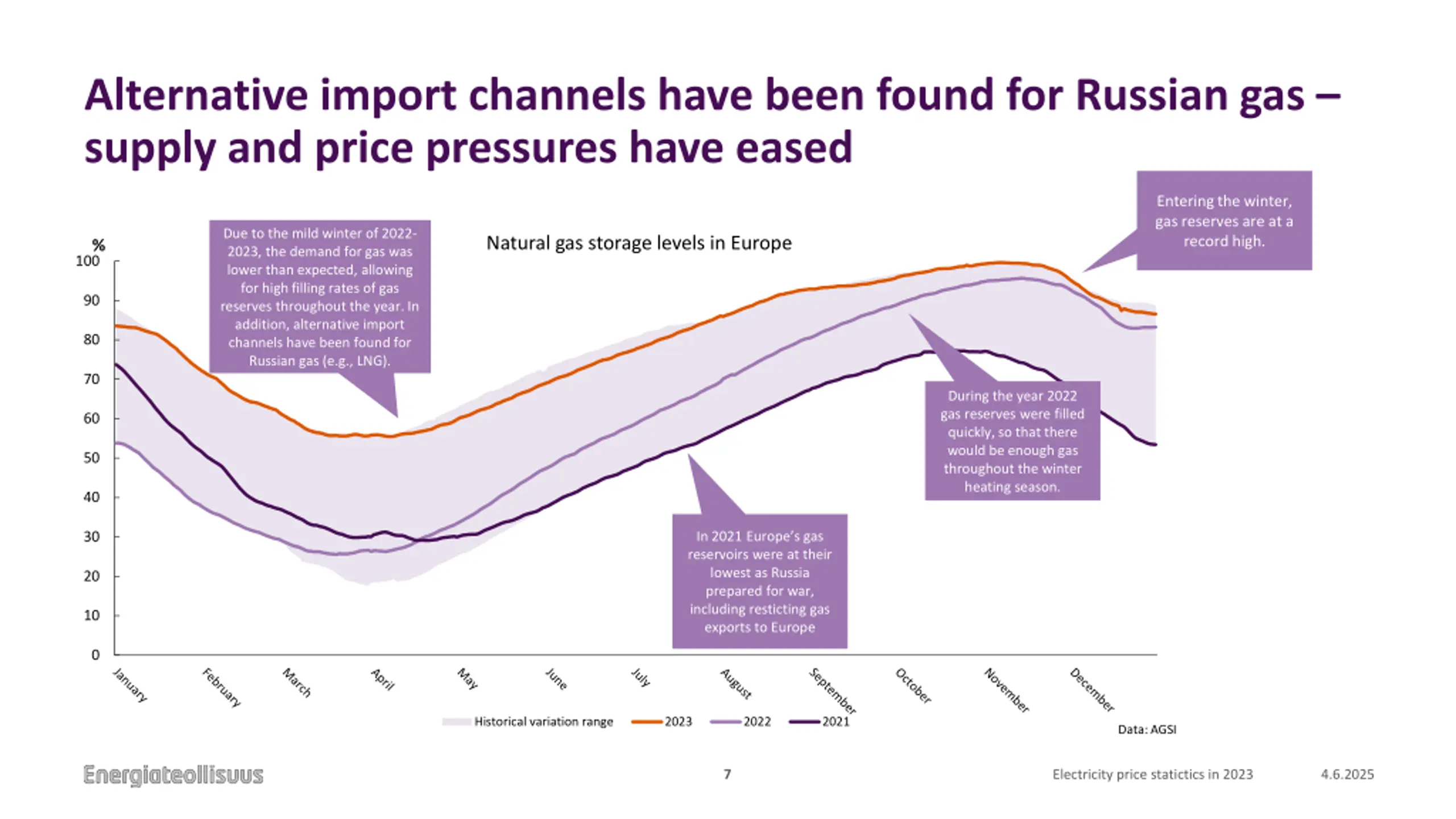 Alternative import channels have been found for Russian gas supply and price pressures have eased 4. record high. Entering the winter, gas reserves are at a Due to the mild winter of 2022- 2023, the demand for gas was lower than expected, allowing for high filling rates of gas reserves throughout the year. In addition, alternative import channels have been found for Russian gas (e.g., LNG). Natural gas storage levels in Europe 3. % 100 90 80 70 During the year 2022 gas reserves were filled quickly, so that there would be enough gas throughout the winter heating season. 60 2. 50 40 1. lowest as Russia prepared for war, including resticting gas exports to Europe 30 In 2021 Europe s gas reservoirs were at their 20 10 0 Historical variation range 2023 2022 2021 Data: AGSI 7 Electricity price statictics in 2023 4.6.2025