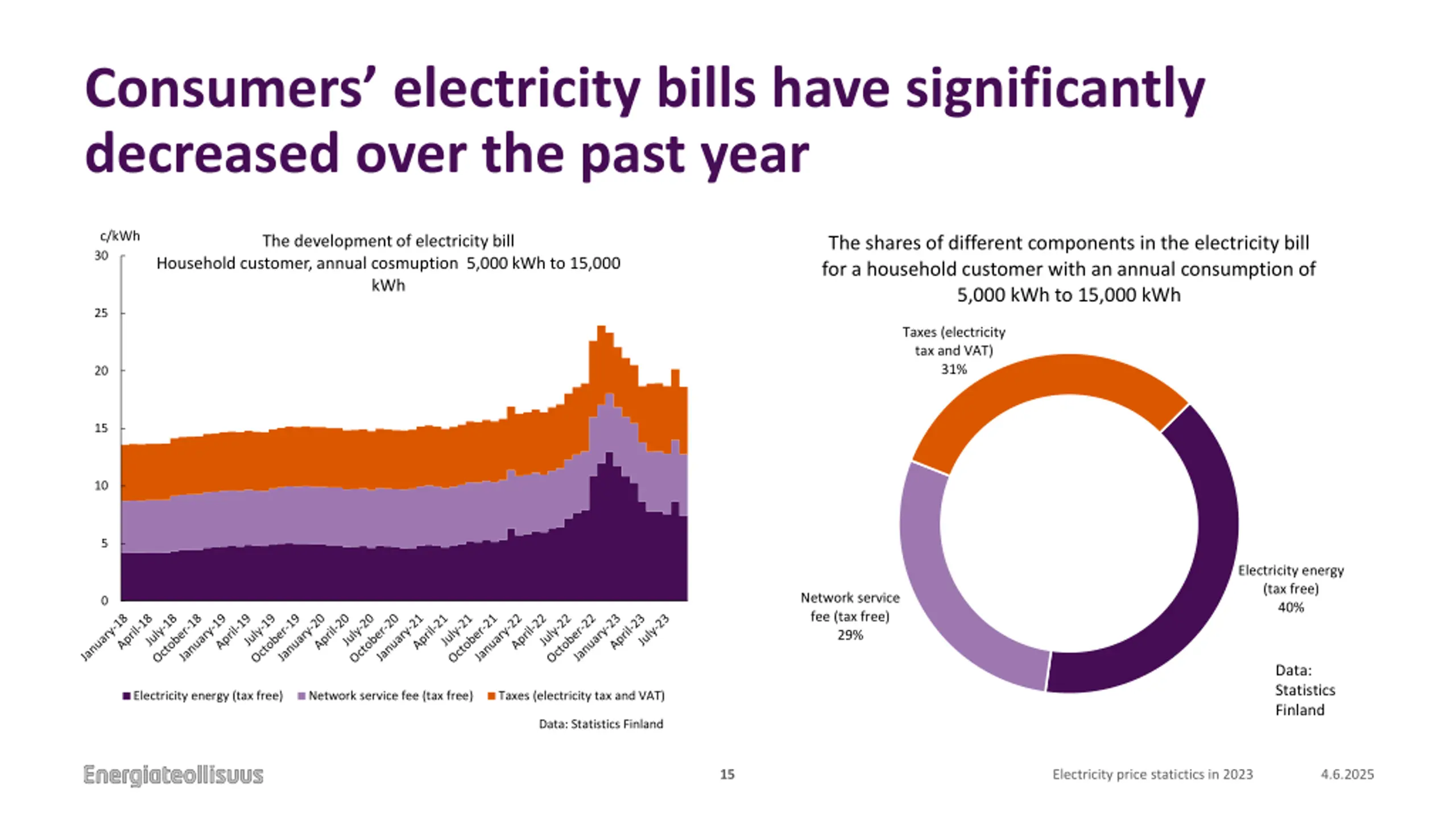 Electricity price fluctuations have increased 2023 average: 56,5 EUR/MWh 2018 average: 46,8 EUR/MWh EUR/MWh Average nominal daily electricity wholesale prices in Finland 300 250 200 150 100 50 0 As a result of the erroneous bid, the price of electricity collapsed well on the negative -50 -100 January February March April May June July August September October November December 2023 2018 Data: Entso-e 14 Electricity price statictics in 2023 4.6.2025