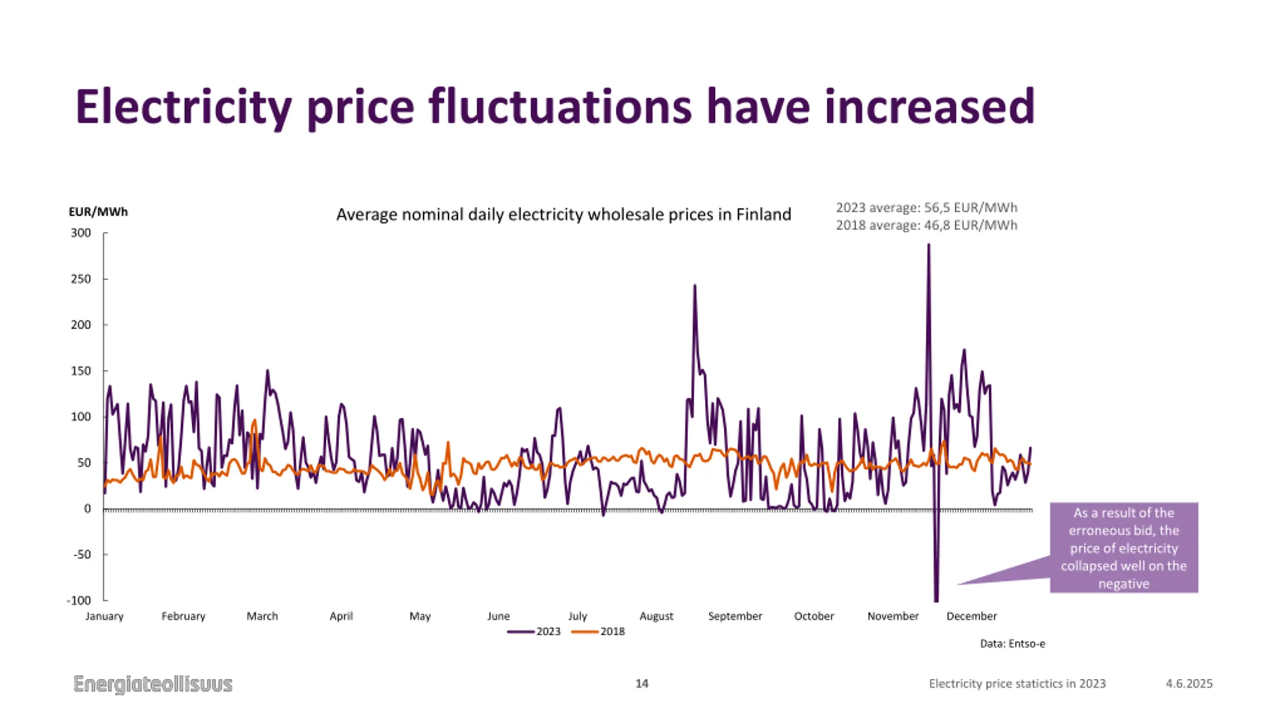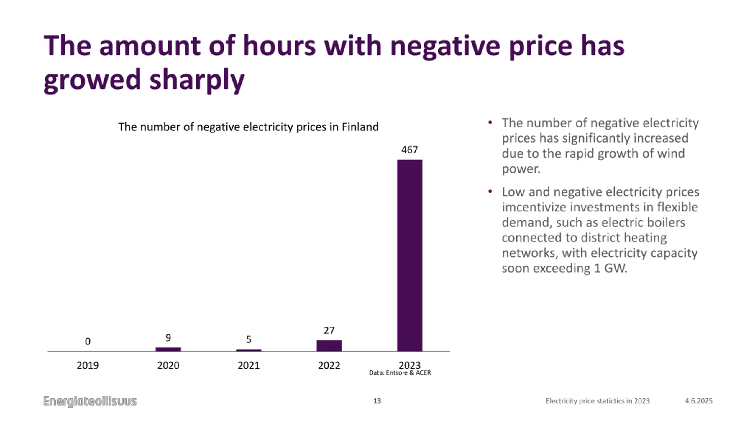 The amount of hours with negative price has growed sharply The number of negative electricity prices has significantly increased due to the rapid growth of wind power. Low and negative electricity prices imcentivize investments in flexible demand, such as electric boilers connected to district heating networks, with electricity capacity soon exceeding 1 GW. The number of negative electricity prices in Finland 467 27 9 5 0 2019 2020 2021 2022 2023 Data: Entso-e & ACER 13 Electricity price statictics in 2023 4.6.2025