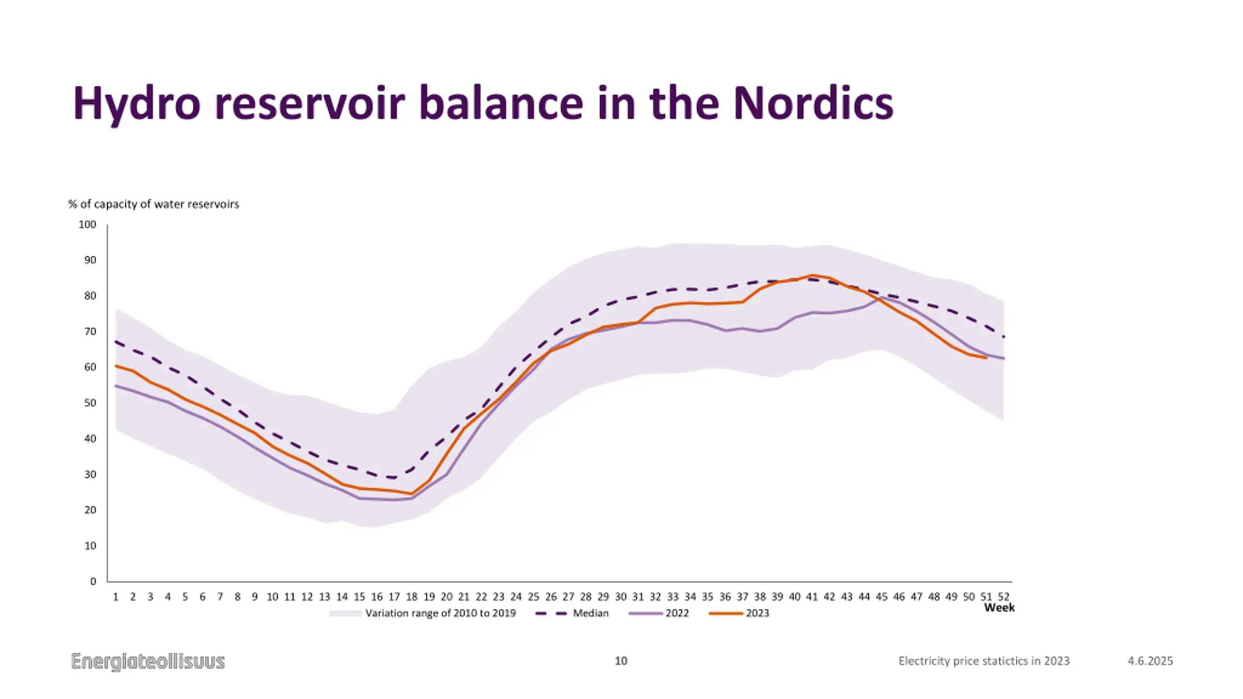 Hydro reservoir balance in the Nordics % of capacity of water reservoirs 100 90 80 70 60 50 40 30 20 10 0 1 2 3 4 5 6 7 8 9 10 11 12 13 14 15 16 17 18 19 20 21 22 23 24 25 26 27 28 29 30 31 32 33 34 35 36 37 38 39 40 41 42 43 44 45 46 47 48 49 50 51 52 Variation range of 2010 to 2019 Median Week 2022 2023 10 Electricity price statictics in 2023 4.6.2025