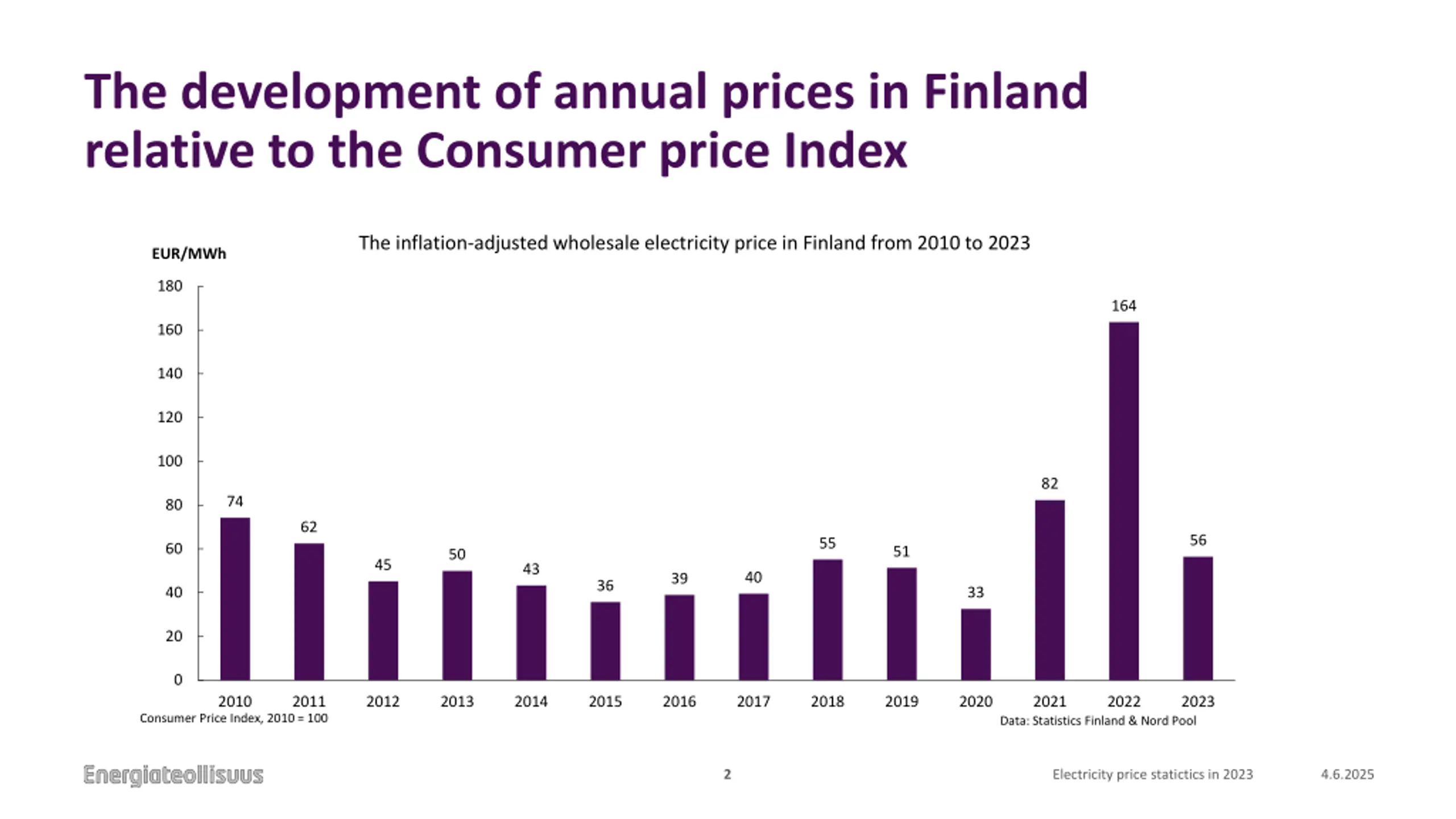The development of annual prices in Finland relative to the Consumer price Index The inflation-adjusted wholesale electricity price in Finland from 2010 to 2023 EUR/MWh 180 164 160 140 120 100 82 74 80 62 56 55 60 51 50 45 43 40 39 36 40 33 20 Data: Nord Pool ja Tilastokeskus 2020 0 2010 2011 2012 2013 2014 2015 2016 2017 2018 2019 2021 2022 2023 Consumer Price Index, 2010 = 100 Data: Statistics Finland & Nord Pool 2 Electricity price statictics in 2023 4.6.2025