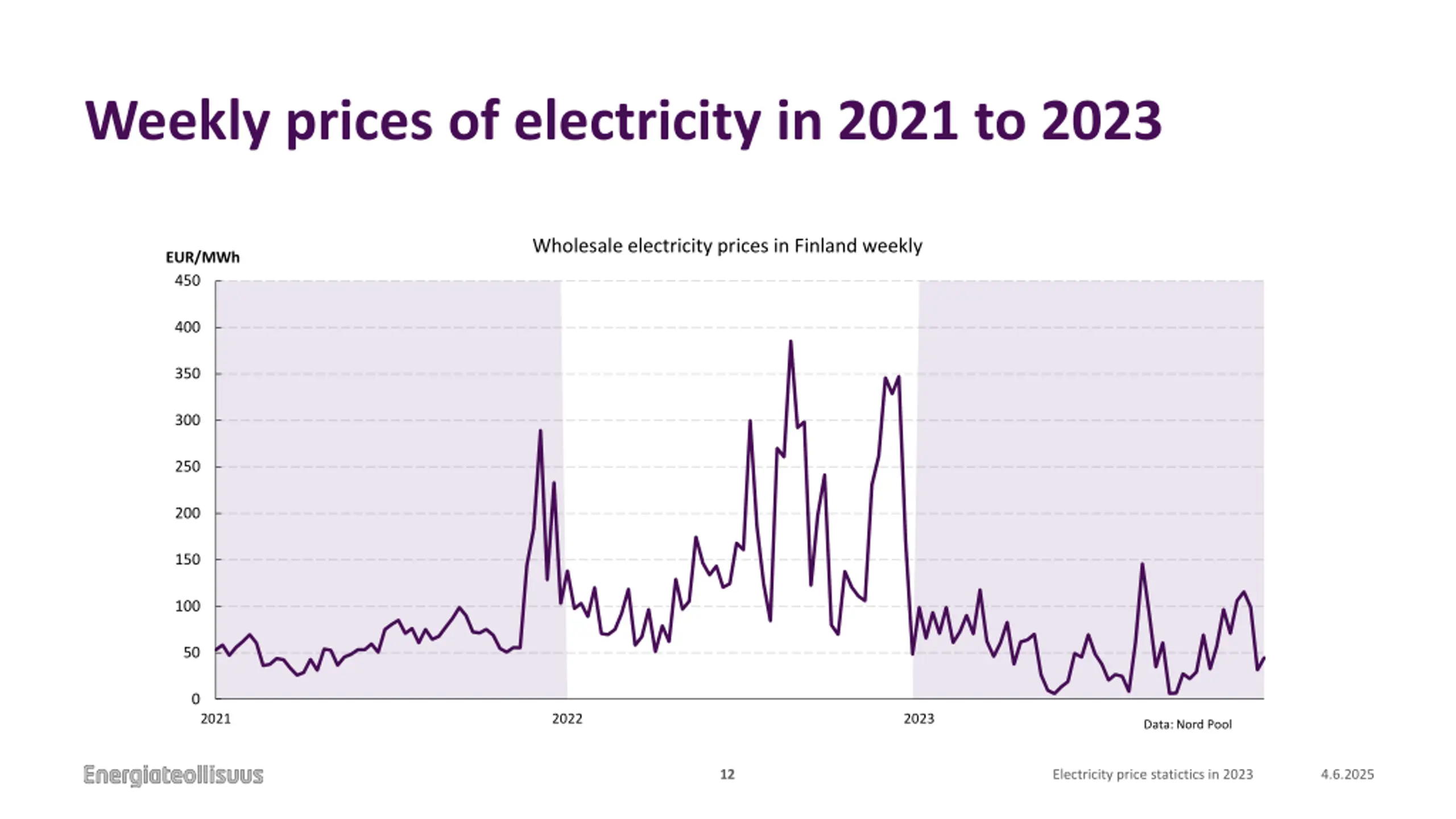 Weekly prices of electricity in 2021 to 2023 Wholesale electricity prices in Finland weekly EUR/MWh 450 400 350 300 250 200 150 100 50 0 2021 2022 2023 Data: Nord Pool 12 Electricity price statictics in 2023 4.6.2025