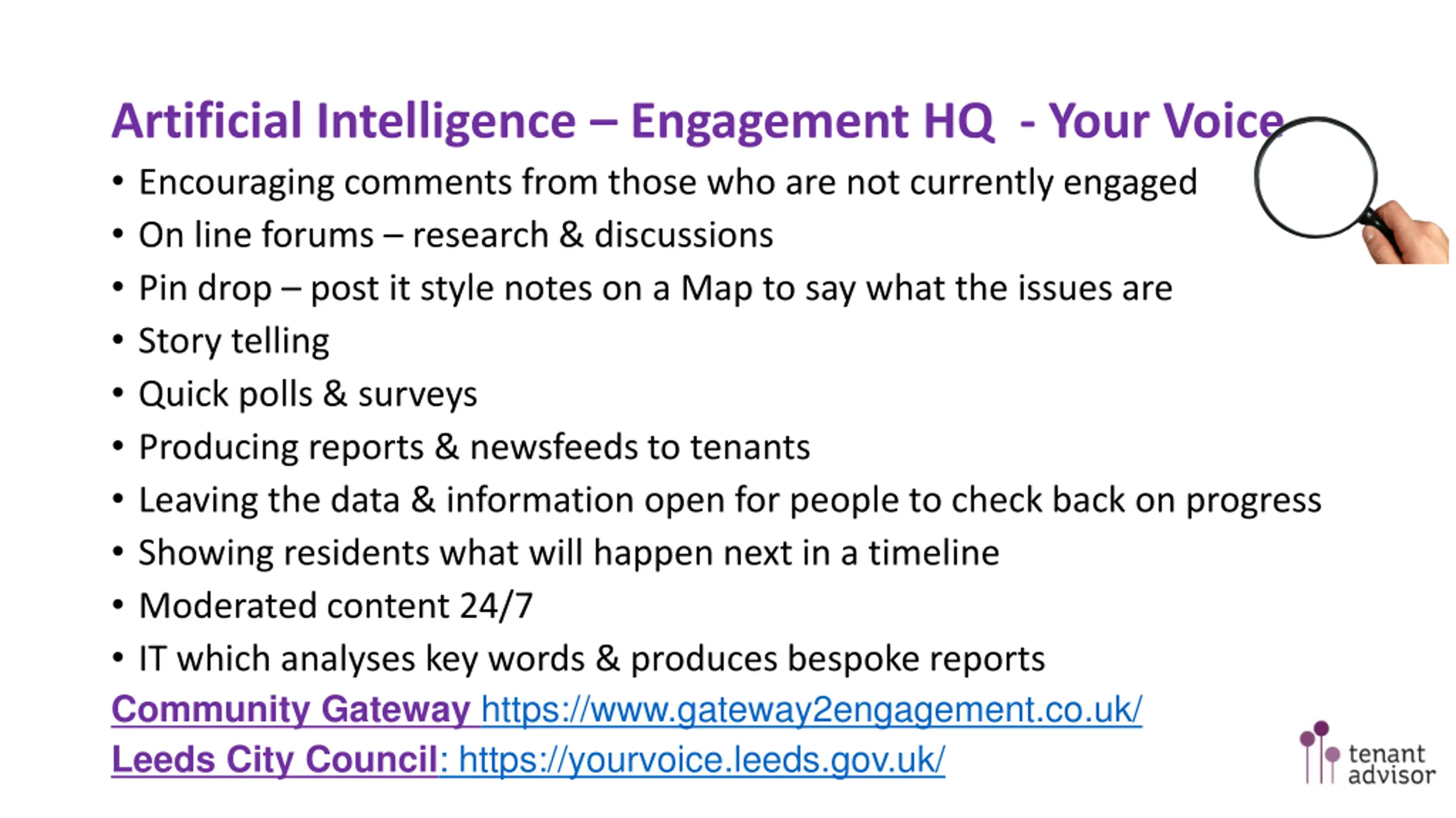 Artificial Intelligence Engagement HQ - Your Voice Encouraging comments from those who are not currently engaged On line forums research & discussions Pin drop post it style notes on a Map to say what the issues are Story telling Quick polls & surveys Producing reports & newsfeeds to tenants Leaving the data & information open for people to check back on progress Showing residents what will happen next in a timeline Moderated content 24/7 IT which analyses key words & produces bespoke reports Community Gateway https://www.gateway2engagement.co.uk/ Leeds City Council: https://yourvoice.leeds.gov.uk/