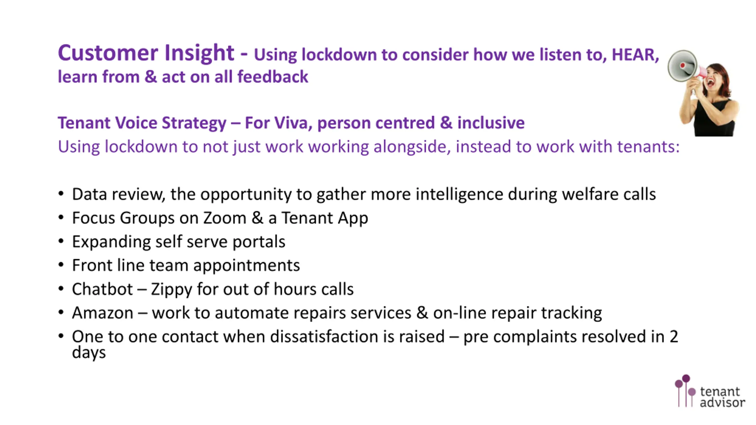 Customer Insight - Using lockdown to consider how we listen to, HEAR, learn from & act on all feedback Tenant Voice Strategy For Viva, person centred & inclusive Using lockdown to not just work working alongside, instead to work with tenants: Data review, the opportunity to gather more intelligence during welfare calls Focus Groups on Zoom & a Tenant App Expanding self serve portals Front line team appointments Chatbot Zippy for out of hours calls Amazon work to automate repairs services & on-line repair tracking One to one contact when dissatisfaction is raised pre complaints resolved in 2 days