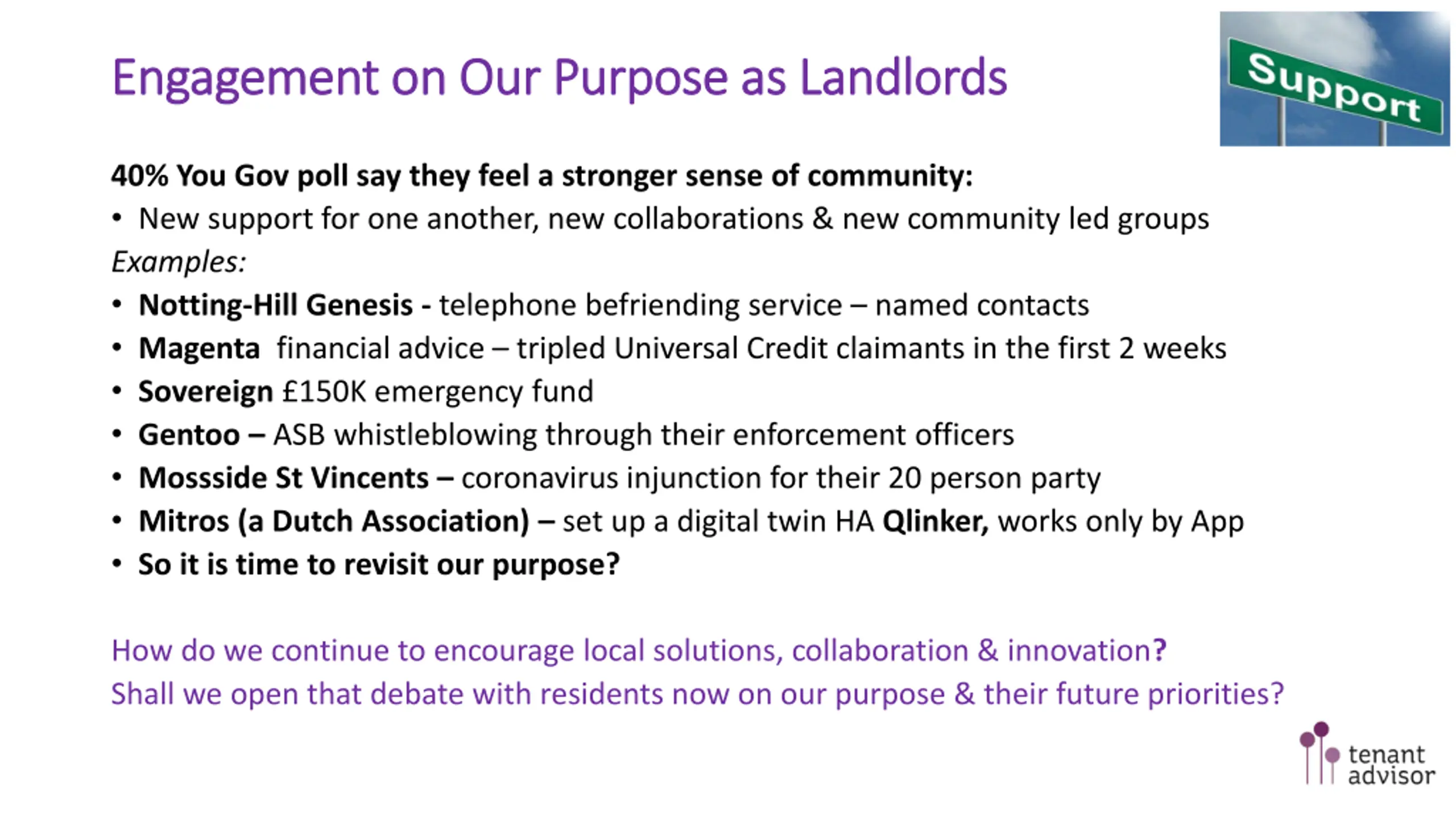 Engagement on Our Purpose as Landlords Engagement on Our Purpose as Landlords 40% You Gov poll say they feel a stronger sense of community: New support for one another, new collaborations & new community led groups Examples: Notting-Hill Genesis - telephone befriending service named contacts Magenta financial advice tripled Universal Credit claimants in the first 2 weeks Sovereign 150K emergency fund Gentoo ASB whistleblowing through their enforcement officers Mossside St Vincents coronavirus injunction for their 20 person party Mitros (a Dutch Association) set up a digital twin HA Qlinker, works only by App So it is time to revisit our purpose? How do we continue to encourage local solutions, collaboration & innovation? Shall we open that debate with residents now on our purpose & their future priorities?