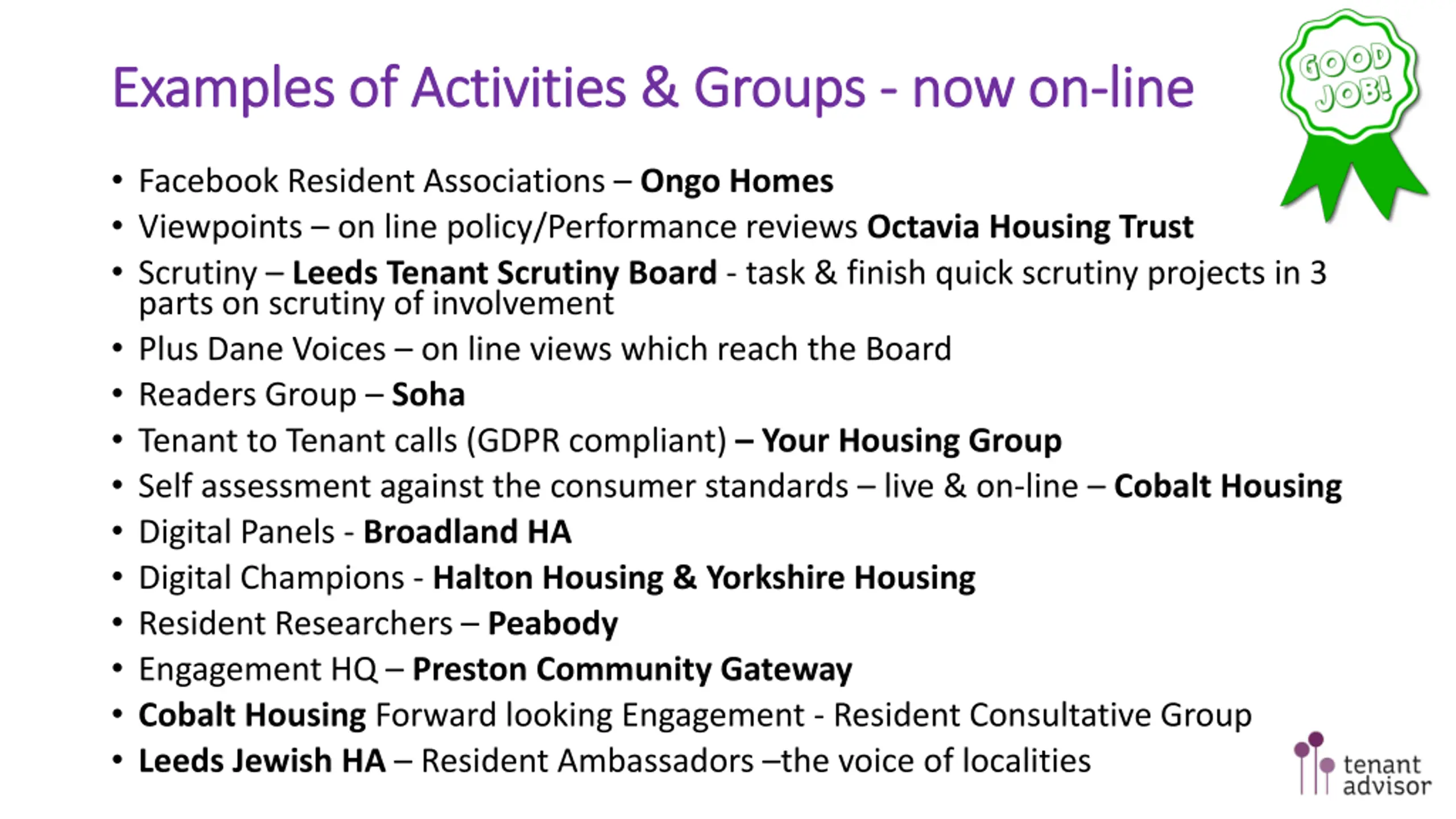Examples of Activities & Groups Examples of Activities & Groups - - now on now on- -line line Facebook Resident Associations Ongo Homes Viewpoints on line policy/Performance reviews Octavia Housing Trust Scrutiny Leeds Tenant Scrutiny Board - task & finish quick scrutiny projects in 3 parts on scrutiny of involvement Plus Dane Voices on line views which reach the Board Readers Group Soha Tenant to Tenant calls (GDPR compliant) Your Housing Group Self assessment against the consumer standards live & on-line Cobalt Housing Digital Panels - Broadland HA Digital Champions - Halton Housing & Yorkshire Housing Resident Researchers Peabody Engagement HQ Preston Community Gateway Cobalt Housing Forward looking Engagement - Resident Consultative Group Leeds Jewish HA Resident Ambassadors the voice of localities