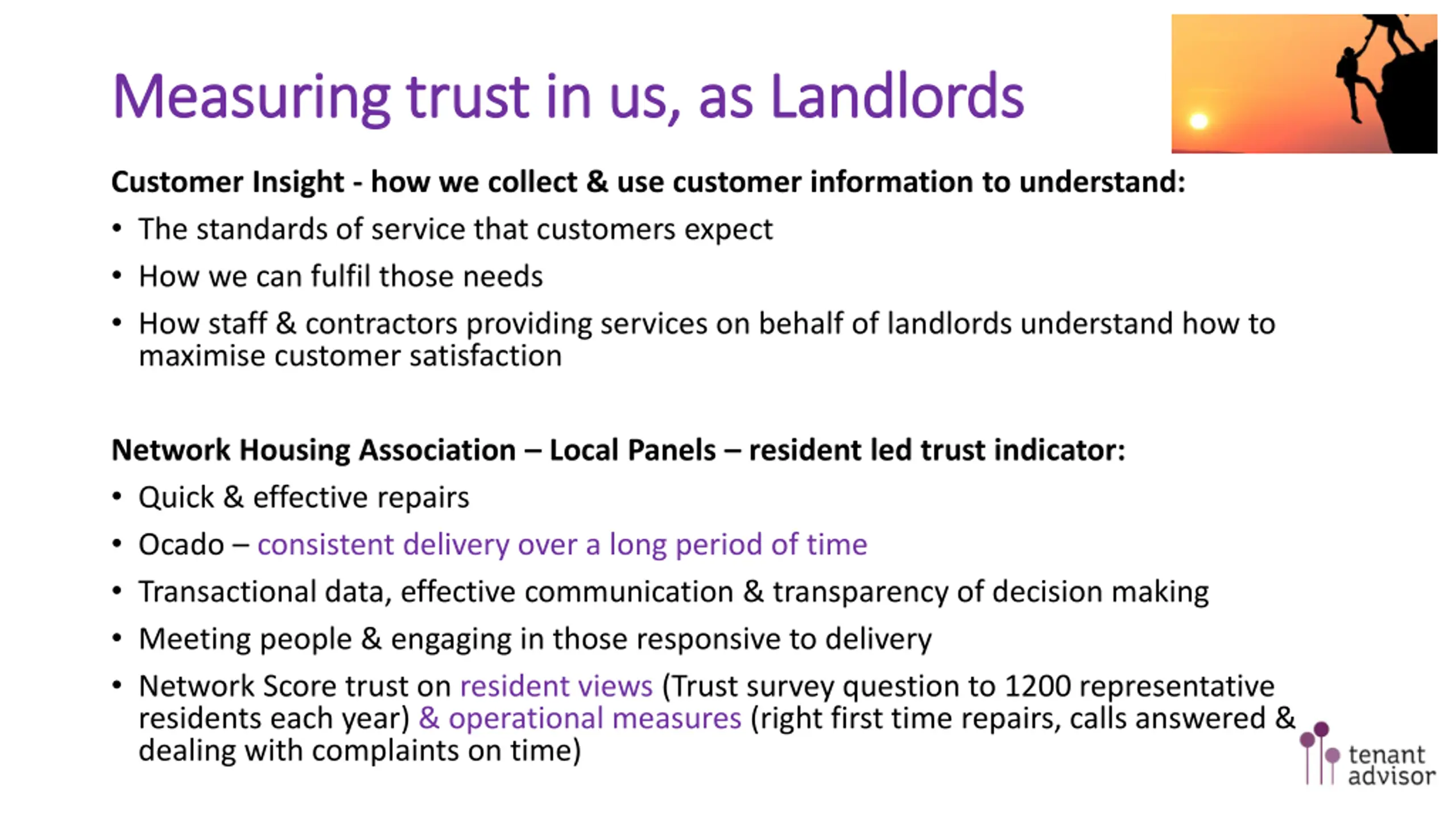 Measuring trust in us, as Landlords Measuring trust in us, as Landlords Customer Insight - how we collect & use customer information to understand: The standards of service that customers expect How we can fulfil those needs How staff & contractors providing services on behalf of landlords understand how to maximise customer satisfaction Network Housing Association Local Panels resident led trust indicator: Quick & effective repairs Ocado consistent delivery over a long period of time Transactional data, effective communication & transparency of decision making Meeting people & engaging in those responsive to delivery Network Score trust on resident views (Trust survey question to 1200 representative residents each year) & operational measures (right first time repairs, calls answered & dealing with complaints on time)