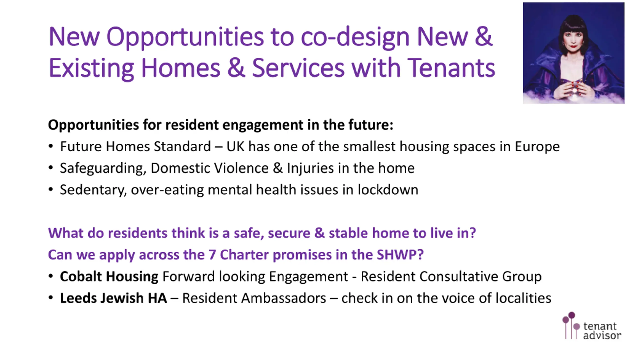 New Opportunities to co New Opportunities to co- -design New & Existing Homes & Services with Tenants Existing Homes & Services with Tenants design New & Opportunities for resident engagement in the future: Future Homes Standard UK has one of the smallest housing spaces in Europe Safeguarding, Domestic Violence & Injuries in the home Sedentary, over-eating mental health issues in lockdown What do residents think is a safe, secure & stable home to live in? Can we apply across the 7 Charter promises in the SHWP? Cobalt Housing Forward looking Engagement - Resident Consultative Group Leeds Jewish HA Resident Ambassadors check in on the voice of localities