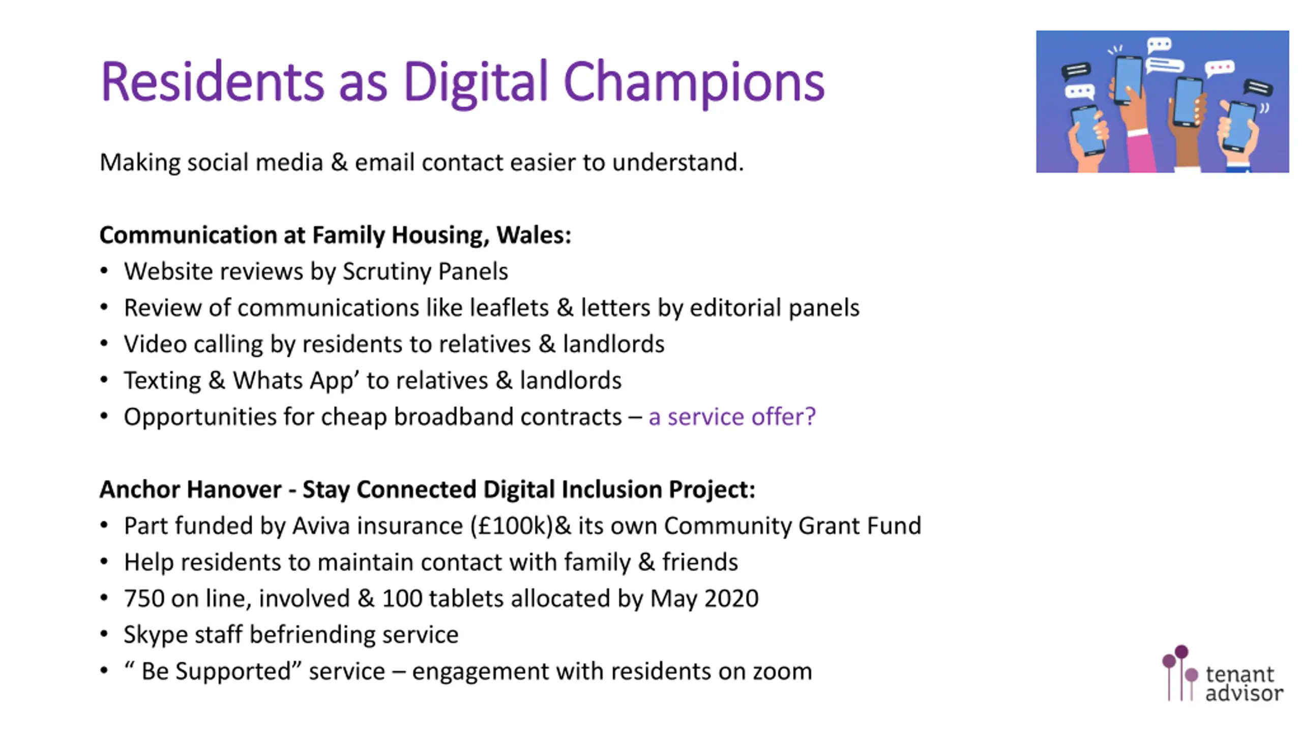 Residents as Digital Champions Residents as Digital Champions Making social media & email contact easier to understand. Communication at Family Housing, Wales: Website reviews by Scrutiny Panels Review of communications like leaflets & letters by editorial panels Video calling by residents to relatives & landlords Texting & Whats App to relatives & landlords Opportunities for cheap broadband contracts a service offer? Anchor Hanover - Stay Connected Digital Inclusion Project: Part funded by Aviva insurance ( 100k)& its own Community Grant Fund Help residents to maintain contact with family & friends 750 on line, involved & 100 tablets allocated by May 2020 Skype staff befriending service Be Supported service engagement with residents on zoom