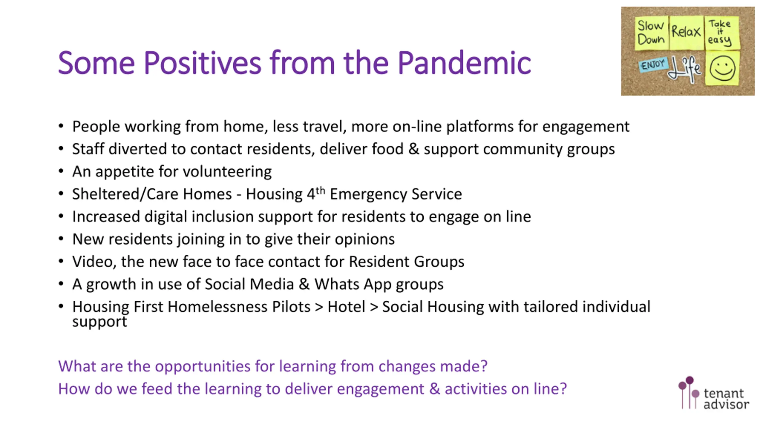 Some Positives from the Pandemic Some Positives from the Pandemic People working from home, less travel, more on-line platforms for engagement Staff diverted to contact residents, deliver food & support community groups An appetite for volunteering Sheltered/Care Homes - Housing 4thEmergency Service Increased digital inclusion support for residents to engage on line New residents joining in to give their opinions Video, the new face to face contact for Resident Groups A growth in use of Social Media & Whats App groups Housing First Homelessness Pilots > Hotel > Social Housing with tailored individual support What are the opportunities for learning from changes made? How do we feed the learning to deliver engagement & activities on line?