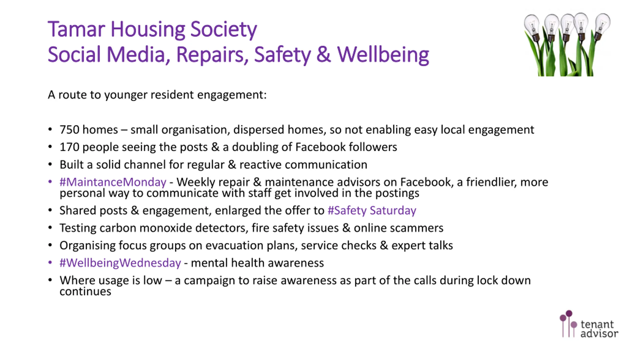 Tamar Housing Society Tamar Housing Society Social Media, Repairs, Safety & Wellbeing Social Media, Repairs, Safety & Wellbeing A route to younger resident engagement: 750 homes small organisation, dispersed homes, so not enabling easy local engagement 170 people seeing the posts & a doubling of Facebook followers Built a solid channel for regular & reactive communication #MaintanceMonday - Weekly repair & maintenance advisors on Facebook, a friendlier, more personal way to communicate with staff get involved in the postings Shared posts & engagement, enlarged the offer to #Safety Saturday Testing carbon monoxide detectors, fire safety issues & online scammers Organising focus groups on evacuation plans, service checks & expert talks #WellbeingWednesday - mental health awareness Where usage is low a campaign to raise awareness as part of the calls during lock down continues