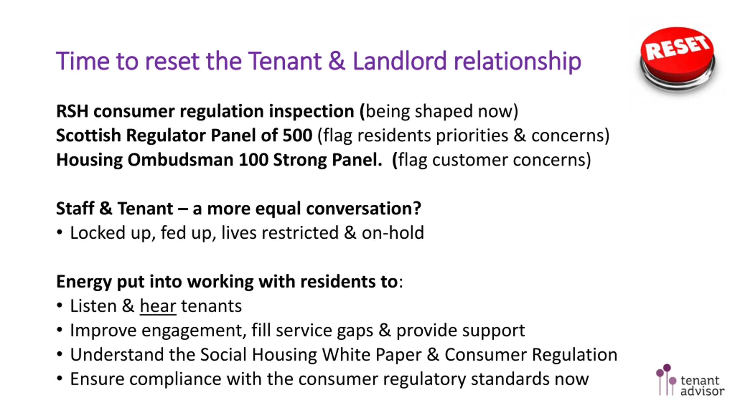 Time to reset the Tenant & Landlord relationship Time to reset the Tenant & Landlord relationship RSH consumer regulation inspection (being shaped now) Scottish Regulator Panel of 500 (flag residents priorities & concerns) Housing Ombudsman 100 Strong Panel. (flag customer concerns) Staff & Tenant a more equal conversation? Locked up, fed up, lives restricted & on-hold Energy put into working with residents to: Listen & hear tenants Improve engagement, fill service gaps & provide support Understand the Social Housing White Paper & Consumer Regulation Ensure compliance with the consumer regulatory standards now