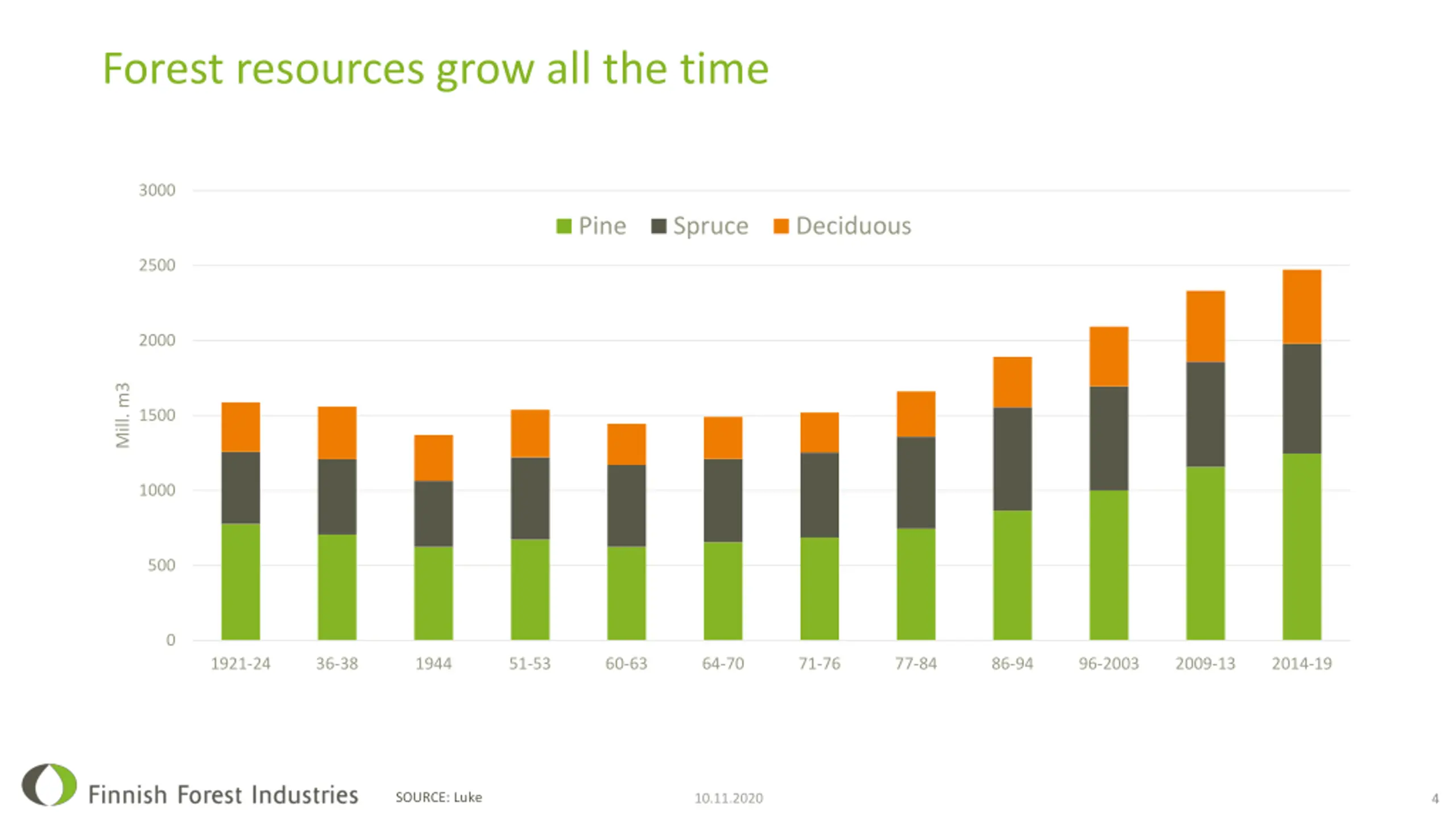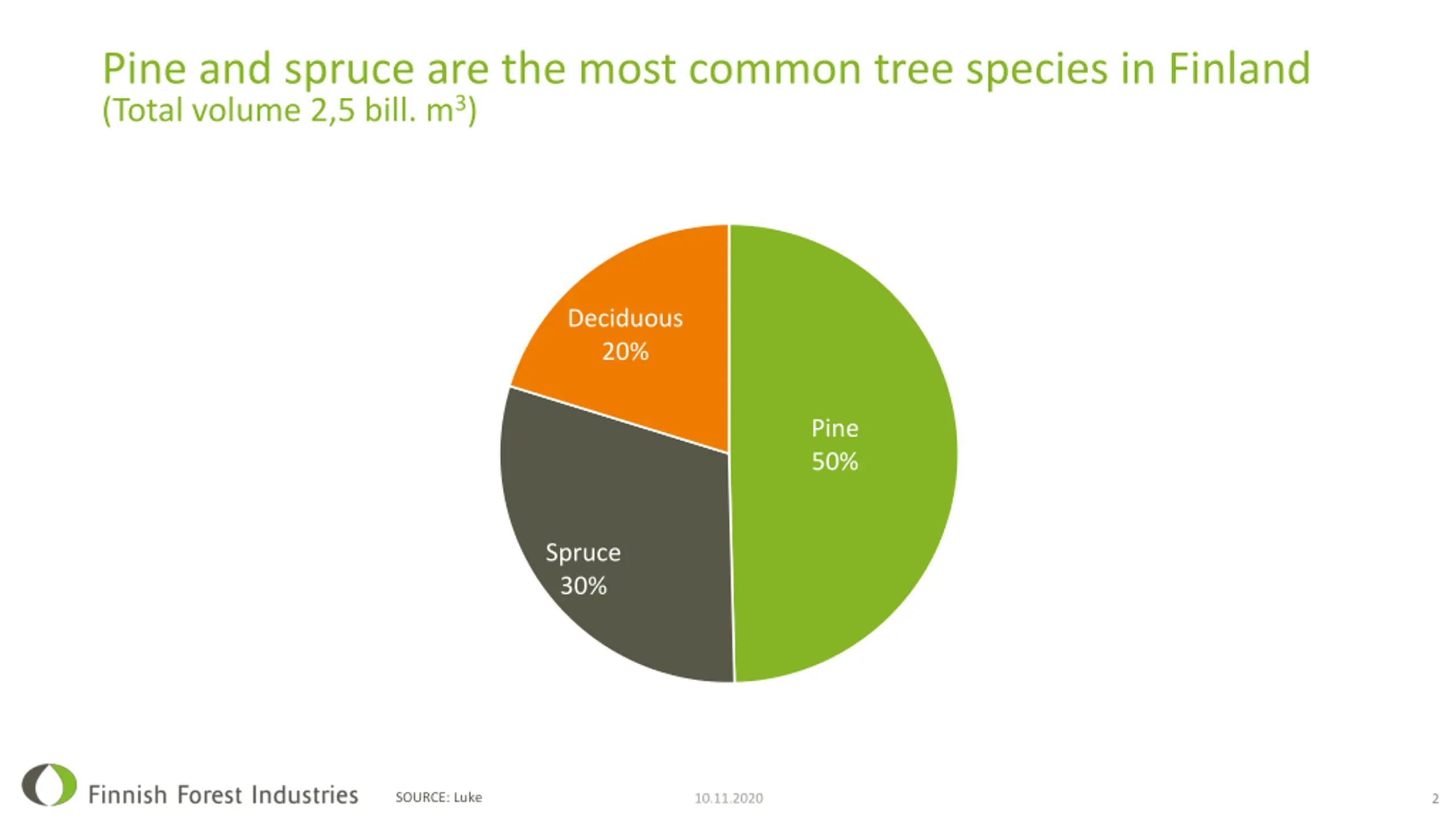 Pine and spruce are the most common tree species in Finland (Total volume 2,5 bill. m3) Deciduous 20% Pine 50% Spruce 30% SOURCE: Luke 10.11.2020 2