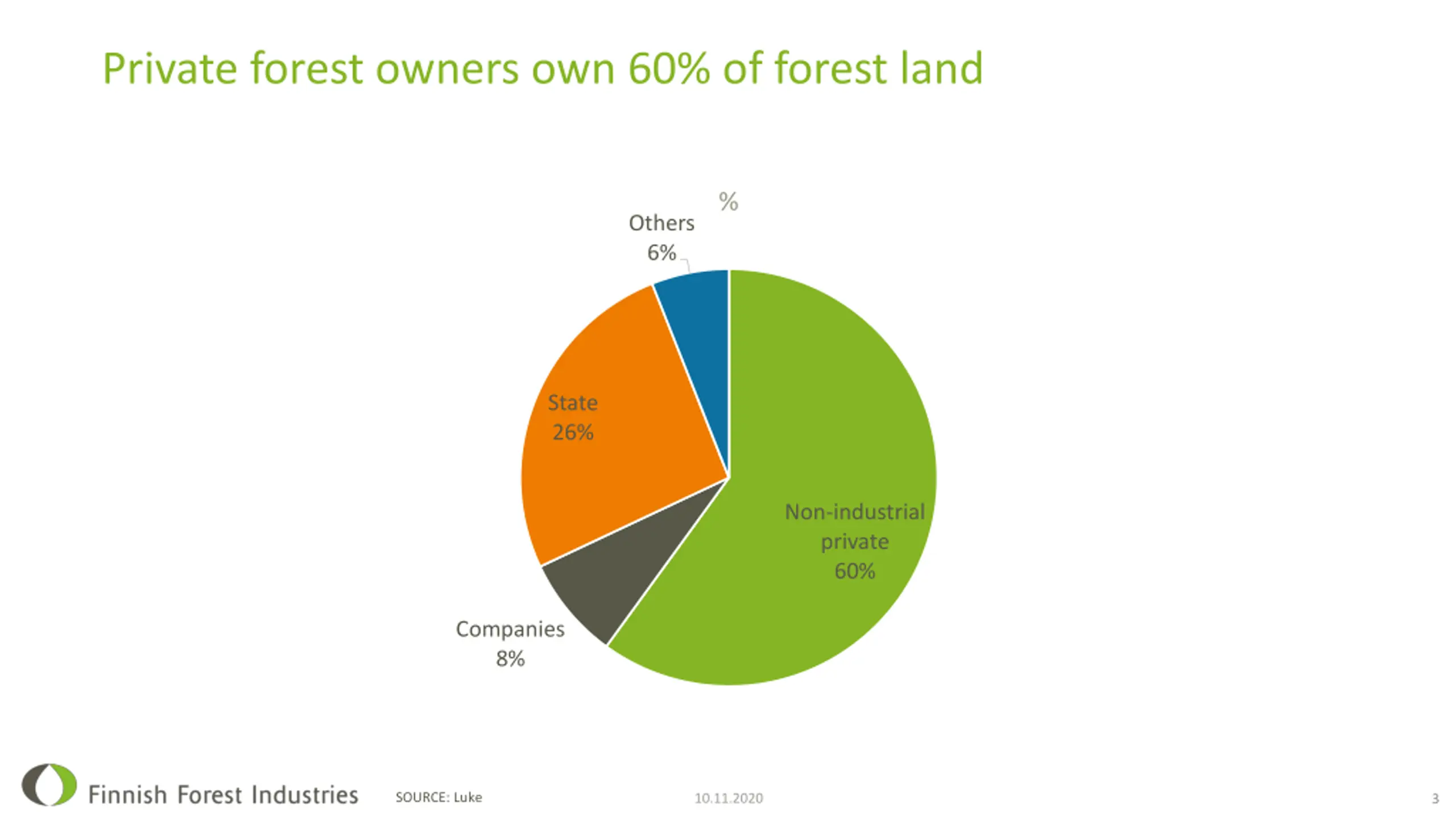 Private forest owners own 60% of forest land % Others 6% State 26% Non-industrial private 60% Companies 8% SOURCE: Luke 10.11.2020 3